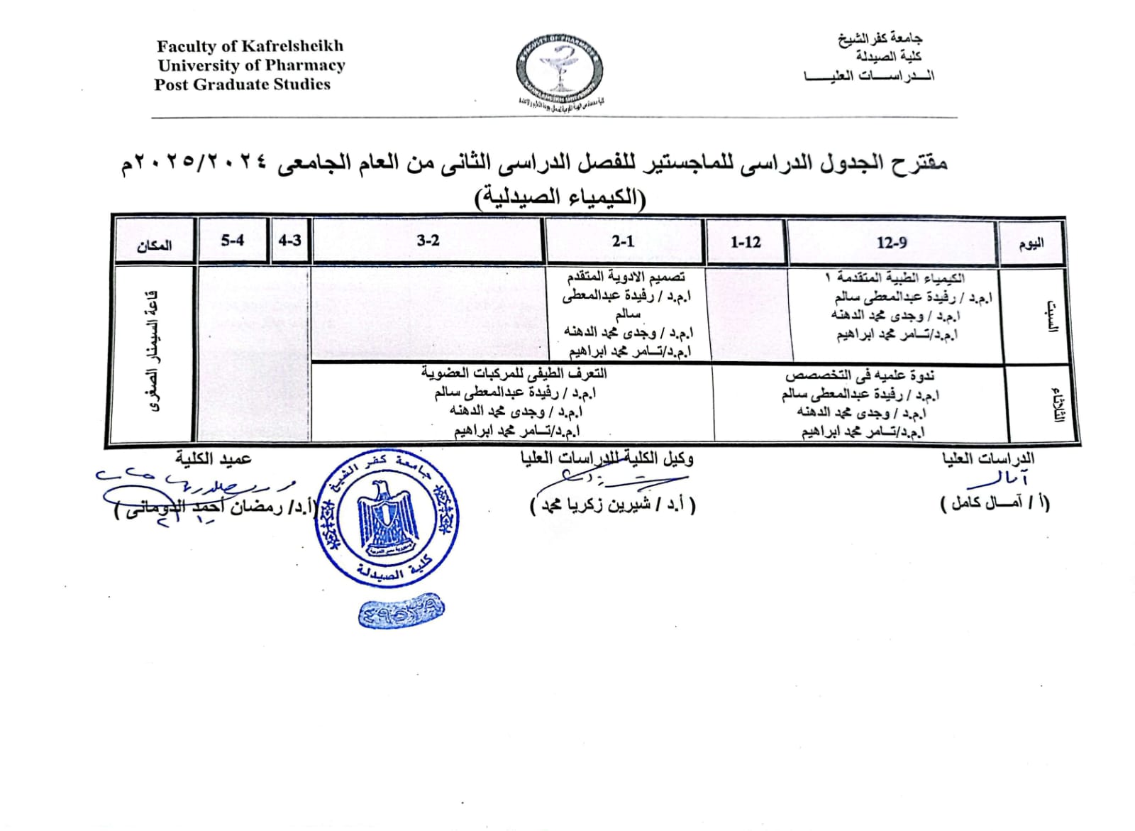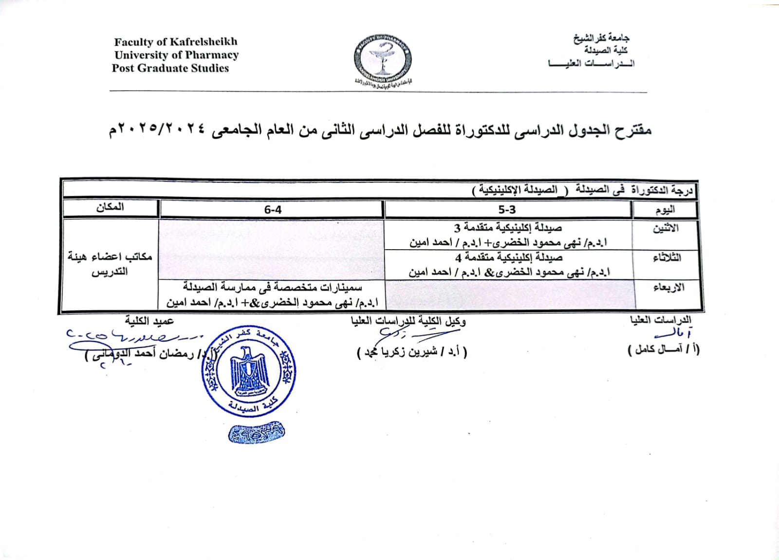 مقترح الجدول الدراسى للدكتوراة للفصل الدراسى الثانى من العام الجامعى 2024/2025 م ( الكيمياء التحليلية الصيدلية )