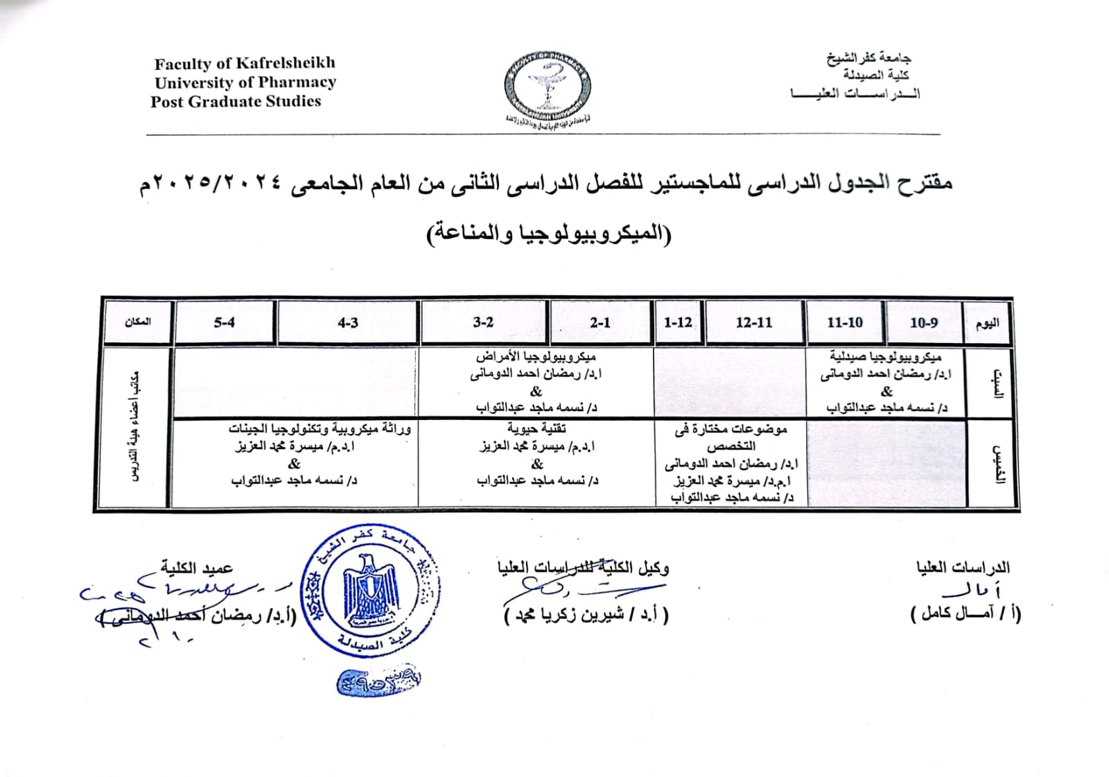 مقترح الجدول الدراسى للماجستير للفصل الدراسى الثانى من العام الجامعى 2024/2025 م ( الميكروبيولوجيا والمناعة )