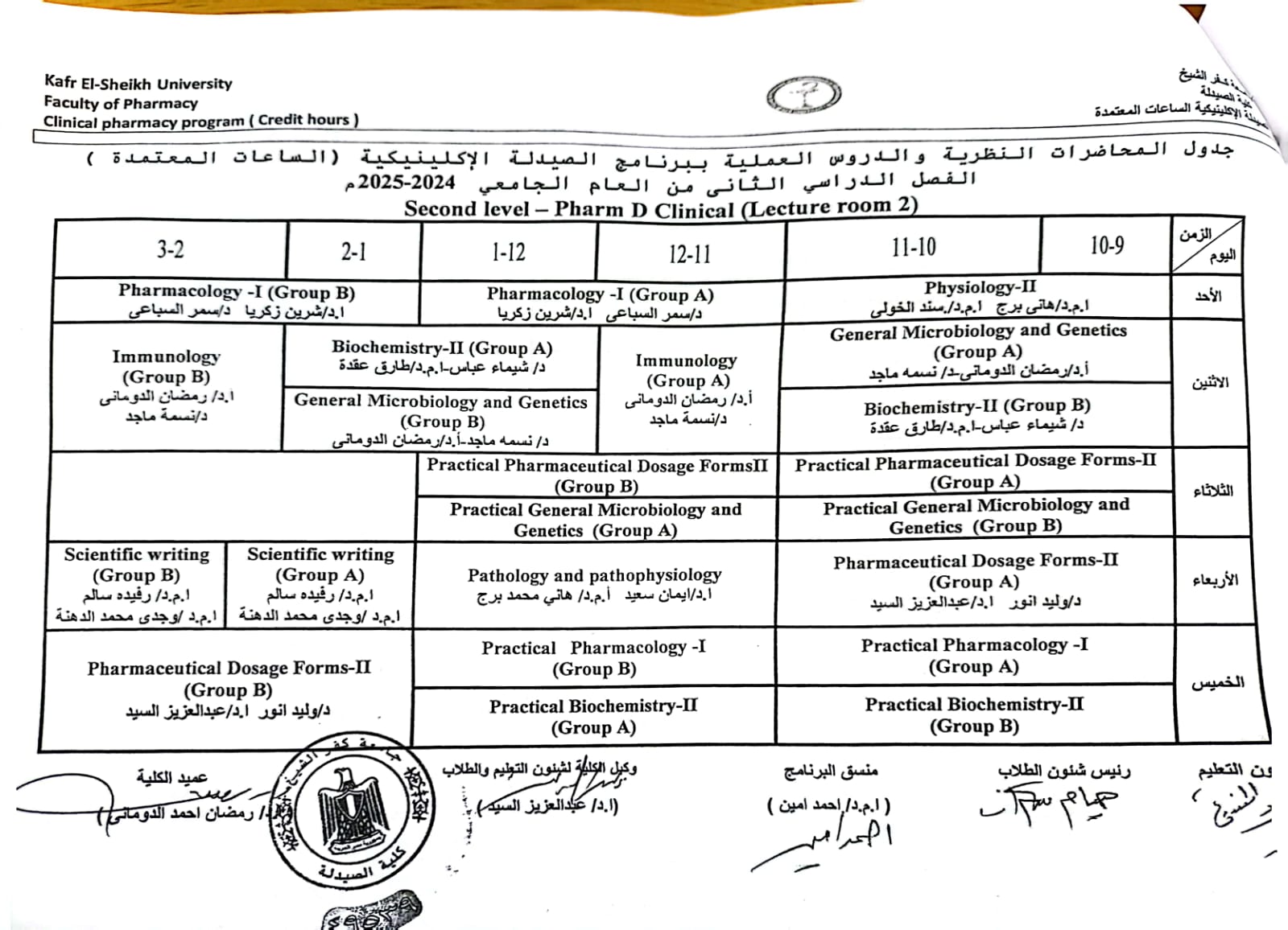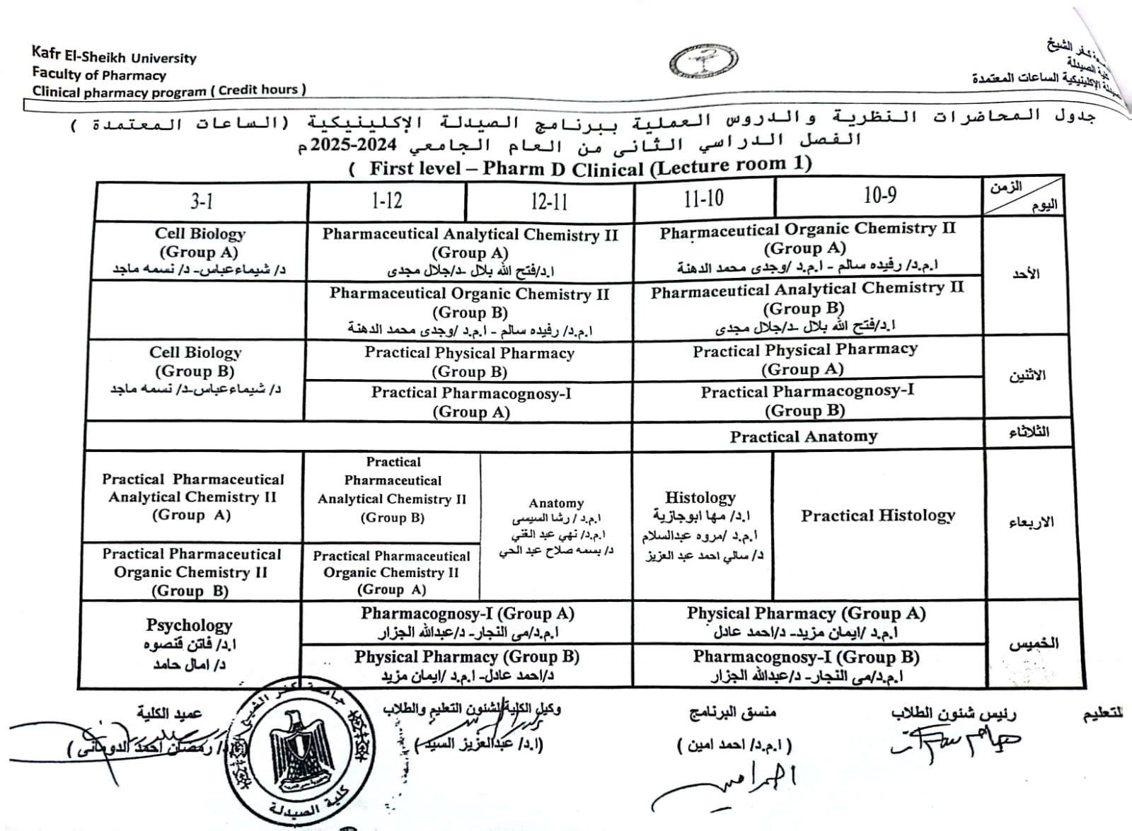 جدول المحاضرات النظرية والدروس العملية ببرنامج الصيدلة الإكلينيكية ( الساعات المعتمدة ) المستوى الثانى فارم دى الفصل الدراسى الأول من العام الجامعى 2026/2025م