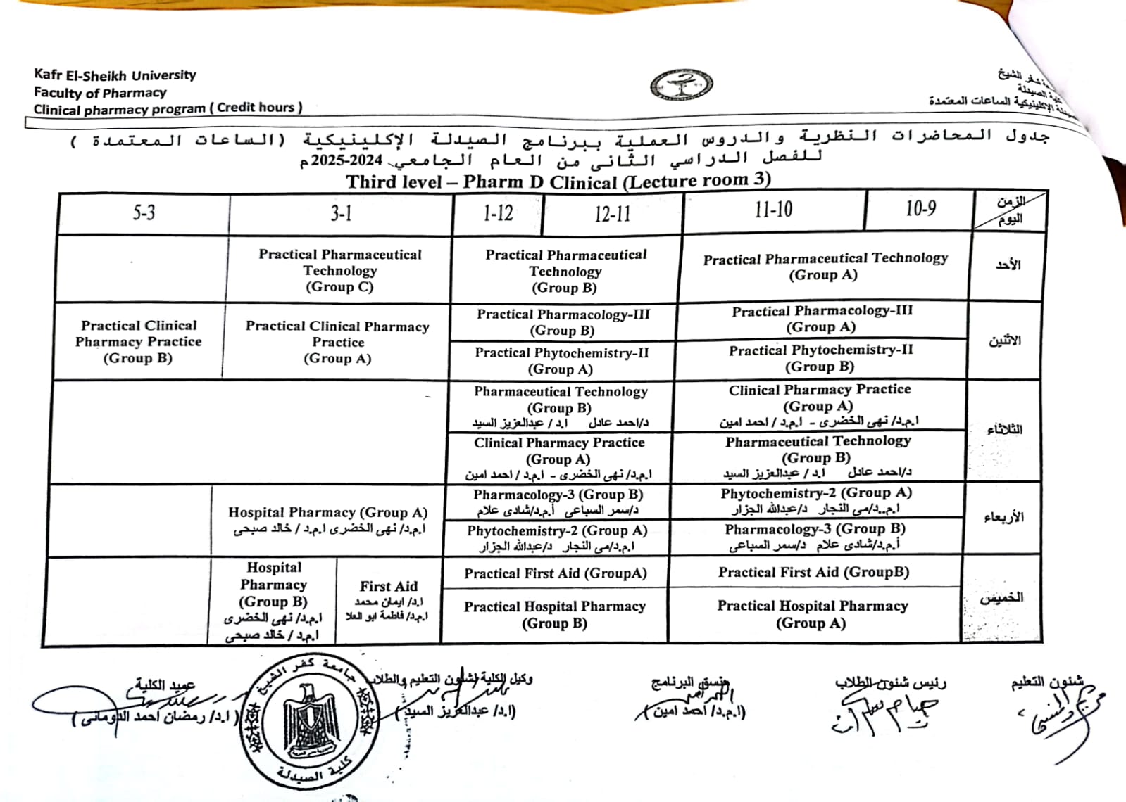 جدول المحاضرات النظرية والدروس العملية ببرنامج الصيدلة الإكلينيكية ( الساعات المعتمدة ) المستوى الثالث فارم دى الفصل الدراسى الأول من العام الجامعى 2026/2025م