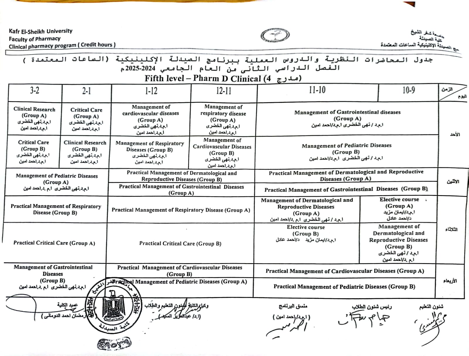 جدول المحاضرات النظرية والدروس العملية ببرنامج الصيدلة الإكلينيكية ( الساعات المعتمدة ) المستوى الخامس فارم دى الفصل الدراسى الأول من العام الجامعى 2026/2025م