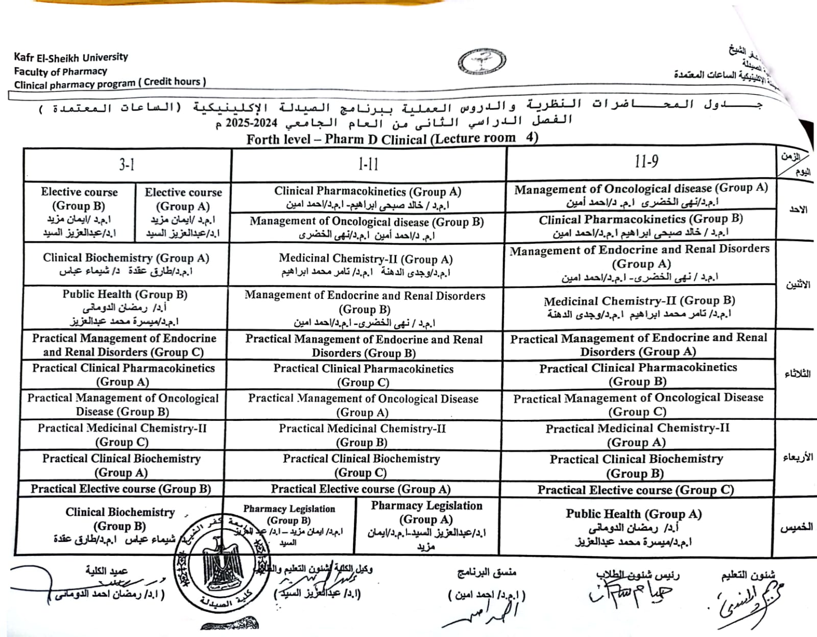 جدول المحاضرات النظرية والدروس العملية ببرنامج الصيدلة الإكلينيكية ( الساعات المعتمدة ) المستوى الرابع فارم دى الفصل الدراسى الأول من العام الجامعى 2026/2025م