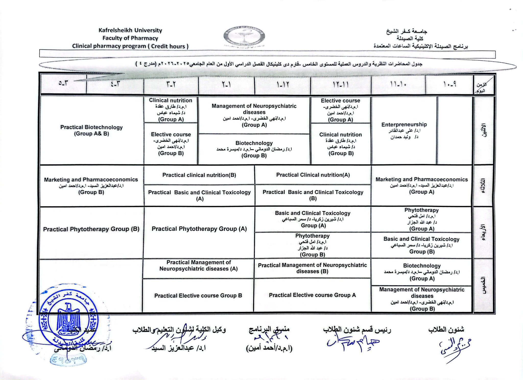 جدول المحاضرات النظرية والدروس العملية للفصل الدراسى الأول من العام الجامعى 2026/2025 م المستوى الخامس فارم دى كلينيكال