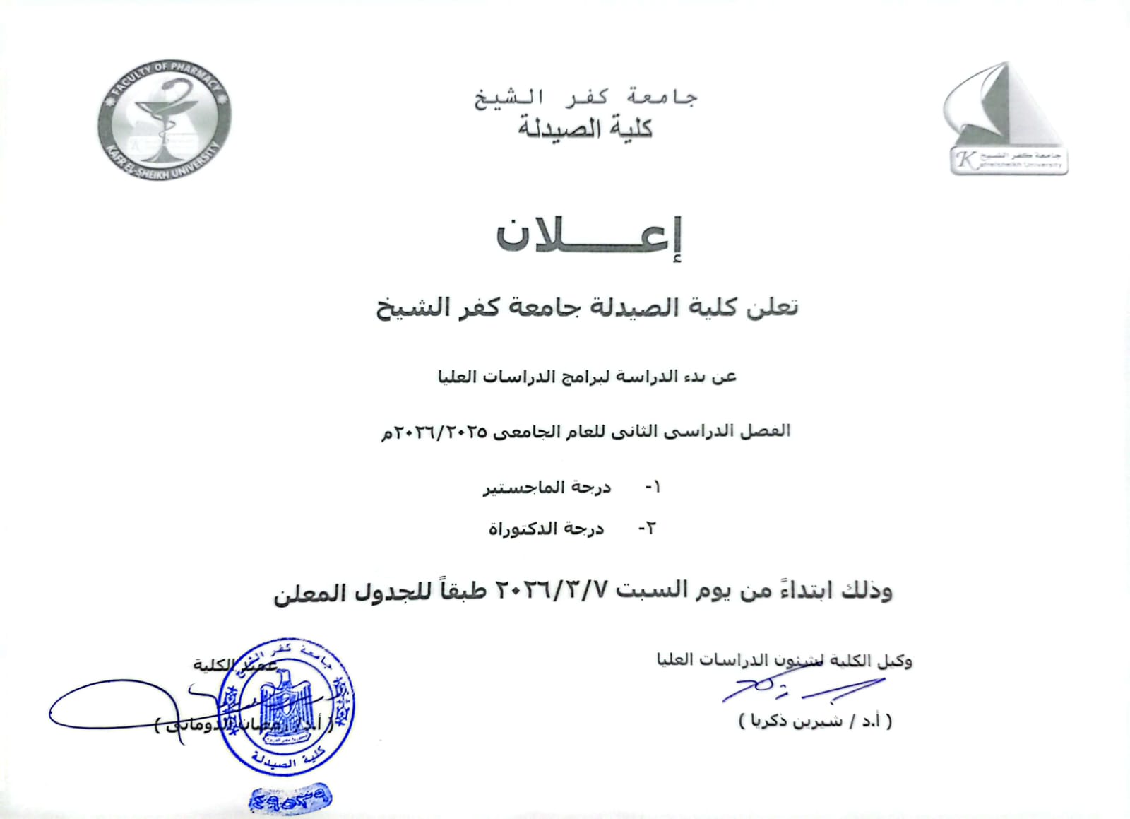 إعلان لطلاب الماجستير والدكتوراه
