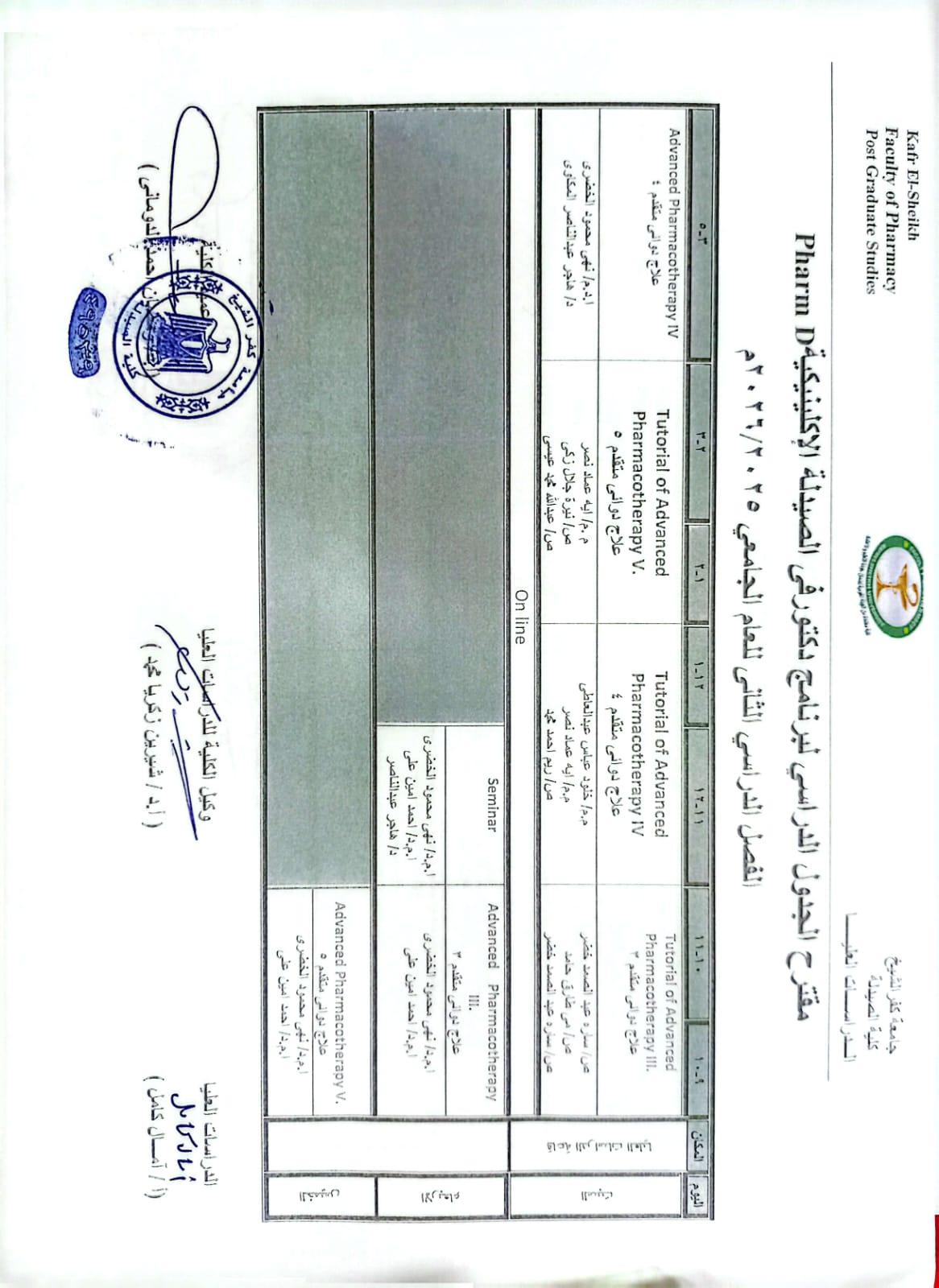 مقترح الجدول الدراسى لبرنامج دكتور فى الصيدلة الإكلينيكية للفصل الدراسى الثانى للعام الجامعى 2025/2026م