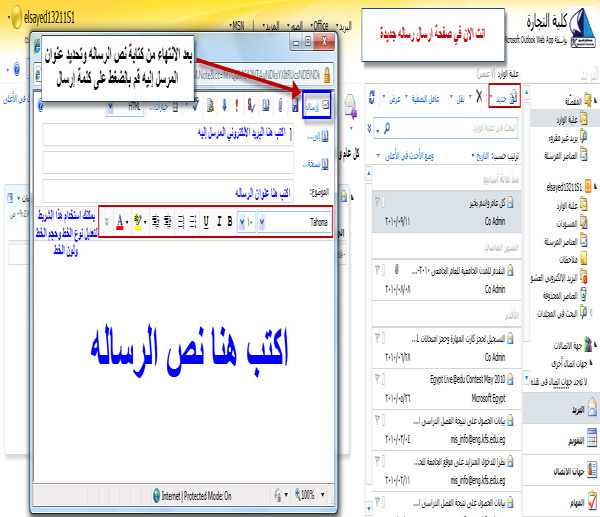 لإرسال رسالة جديدة قم بالضغط على كلمة جديد الموجودة اعلى يمين الصفحة الرئيسية للبريد الألكتروني ثم اتبع التعليمات كما في الصوره أدناه :