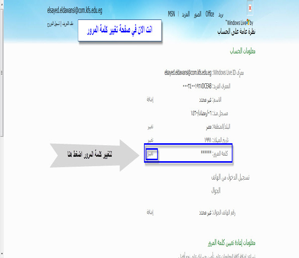 لتغيير كلمة المرور اضغط على تغيير كلمة المرور ستفتح لك صفحة تغييركلمة مرور البريد الالكتروني انزل اسفل الصفحه مقابل كلمة المرور واضفط على زر تغيير كما هو موضح بالصورة ادناه :