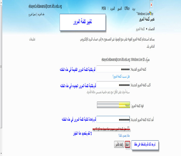 سيتم فتح صفحة جديدة بها ثلاث خانات الخانه الأولى نضع بها كلمة المرور القديمة والخانة الثانية نضع بها كلمة المرور الجديده المراد التغيير اليها والخانة الثالثة قم بإعادة كتابة كلمة المرور الجديدة كما هو موضح بالصورة أدناه :
