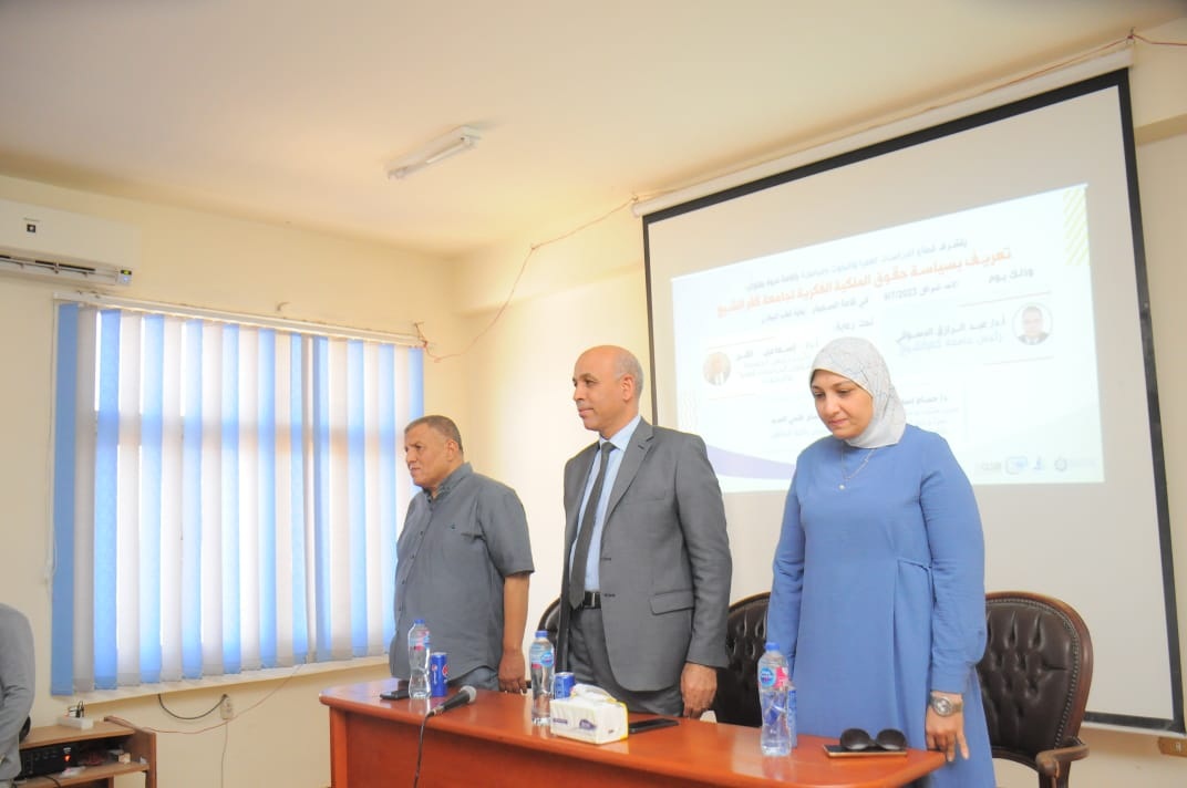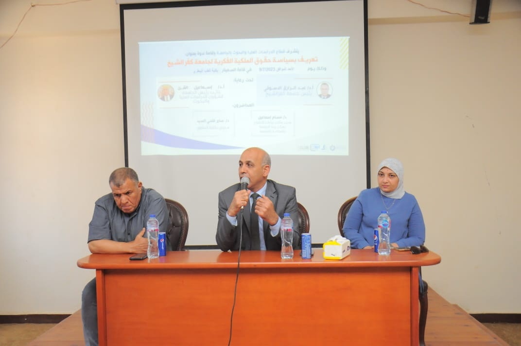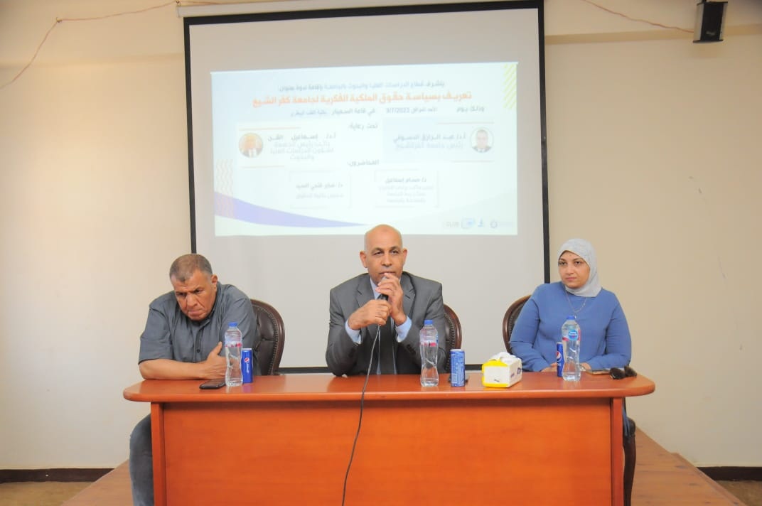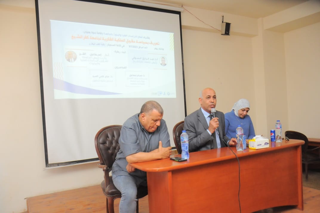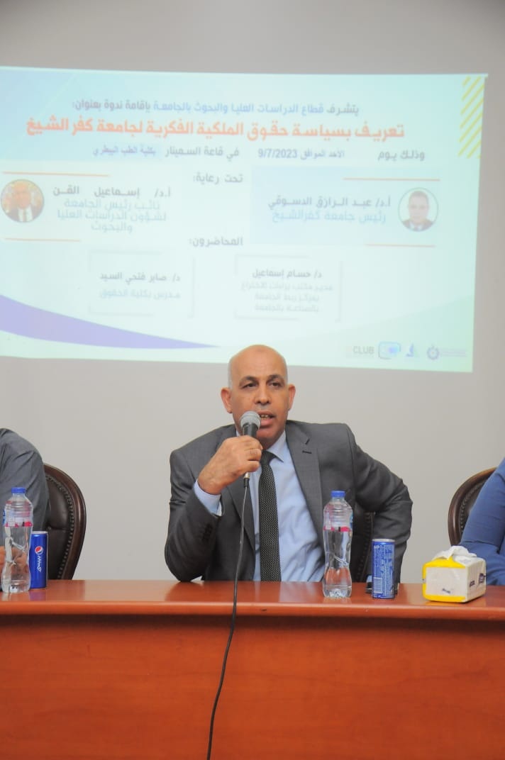 تحت رعاية ا د/ عبدالرازق دسوقي رئيس الجامعة و ا د/ اسماعيل القن نائب رئيس الجامعة لشئون الدراسات العليا والبحوث فقد تم تنفيذ ندوة علمية بعنوان " تعريف بسياسة حقوق الملكية الفكرية لجامعة كفرالشيخ" وذلك بقاعة السيمنار بكلية الطب البيطري وجاء ذلك بحضور ا د/ اسماعيل اسماعيل القن نائب رئيس الجامعة لشئون الدراسات العليا والبحوث و اد/ بسيوني هليل عميد الطب البيطري ووكلاء الكلية وأعضاء هيئة التدريس والهيئة المعاونة بالكلية