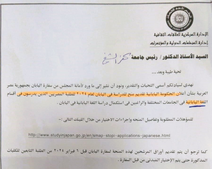 ورد لأمانة المجلس الأعلى للجامعات من سفارة اليابان بجمهورية مصر العربية أن الحكومة اليابانية تقدم منح للدراسة فى اليابان لعام 2024 للطلبة المصريين الذين يدرسون في أقسام اللغة اليابانية فى الجامعات المختلفة والراغبين فى استكمال دراسة اللغة اليابانية في اليابان .