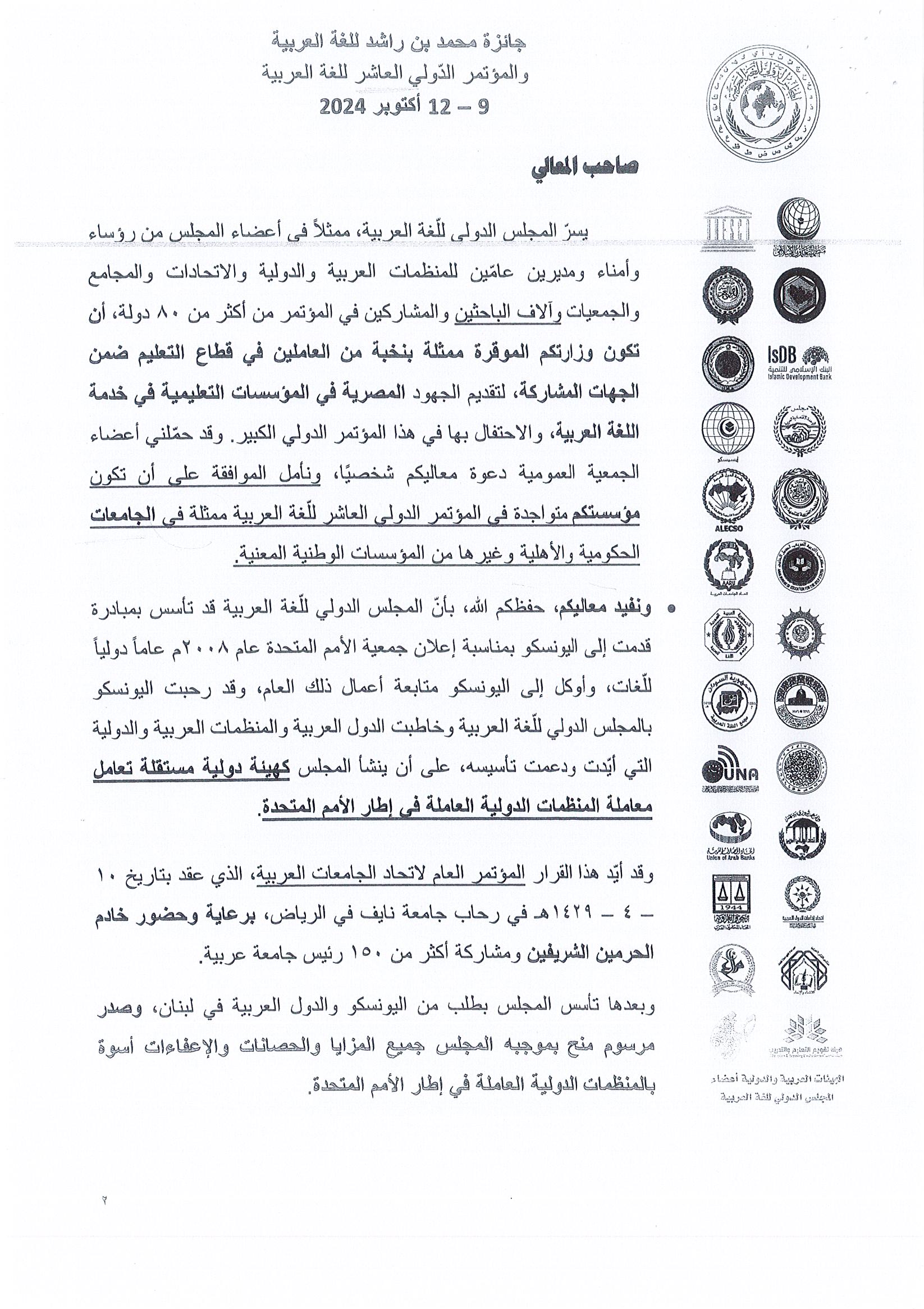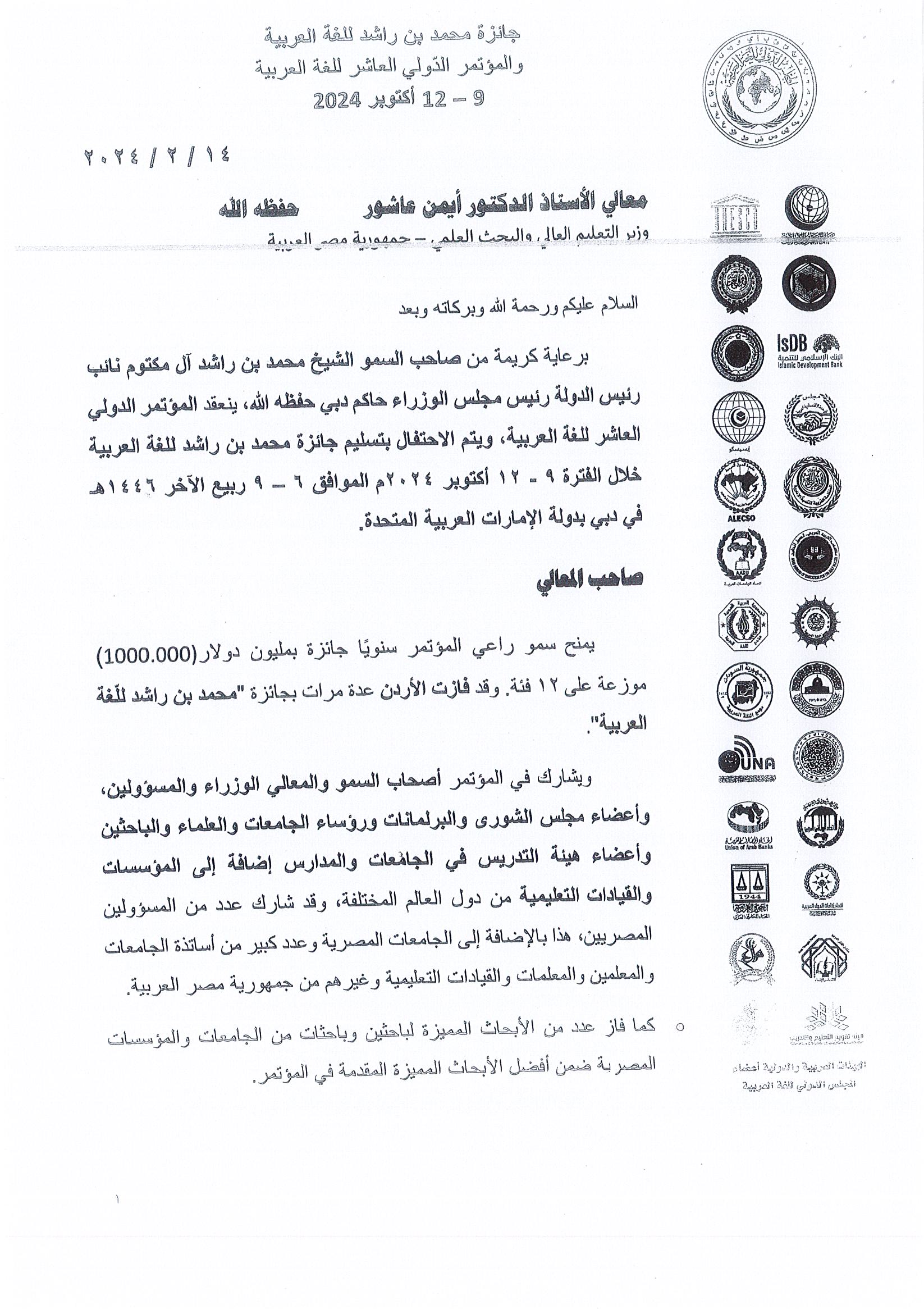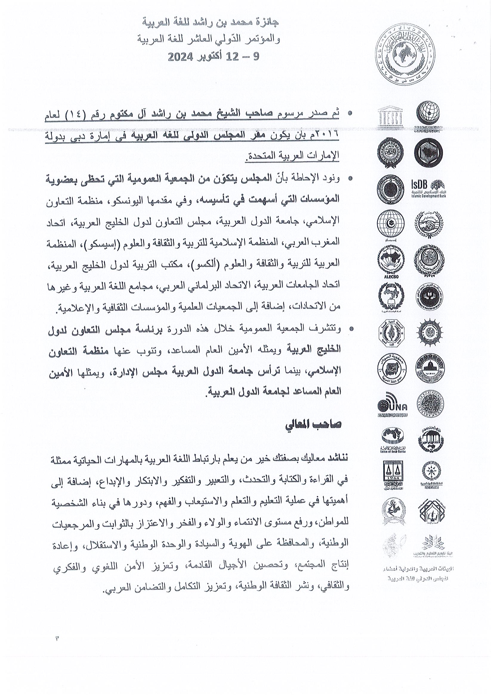 إعتزام المجلس الدولى للغة العربية عقد المؤتمر الدولى العاشر للغة العربية والإحتفال بتسليم جائزة محمد بن راشد للغة العربية