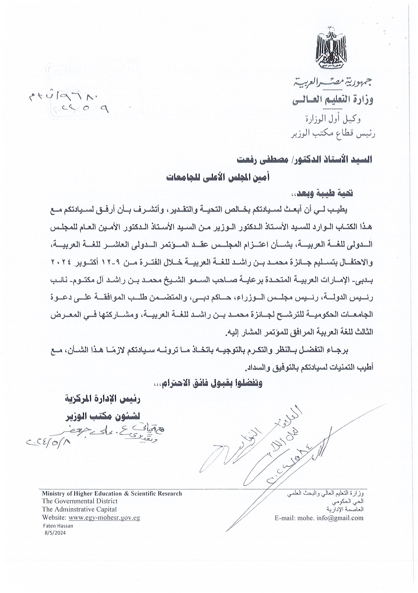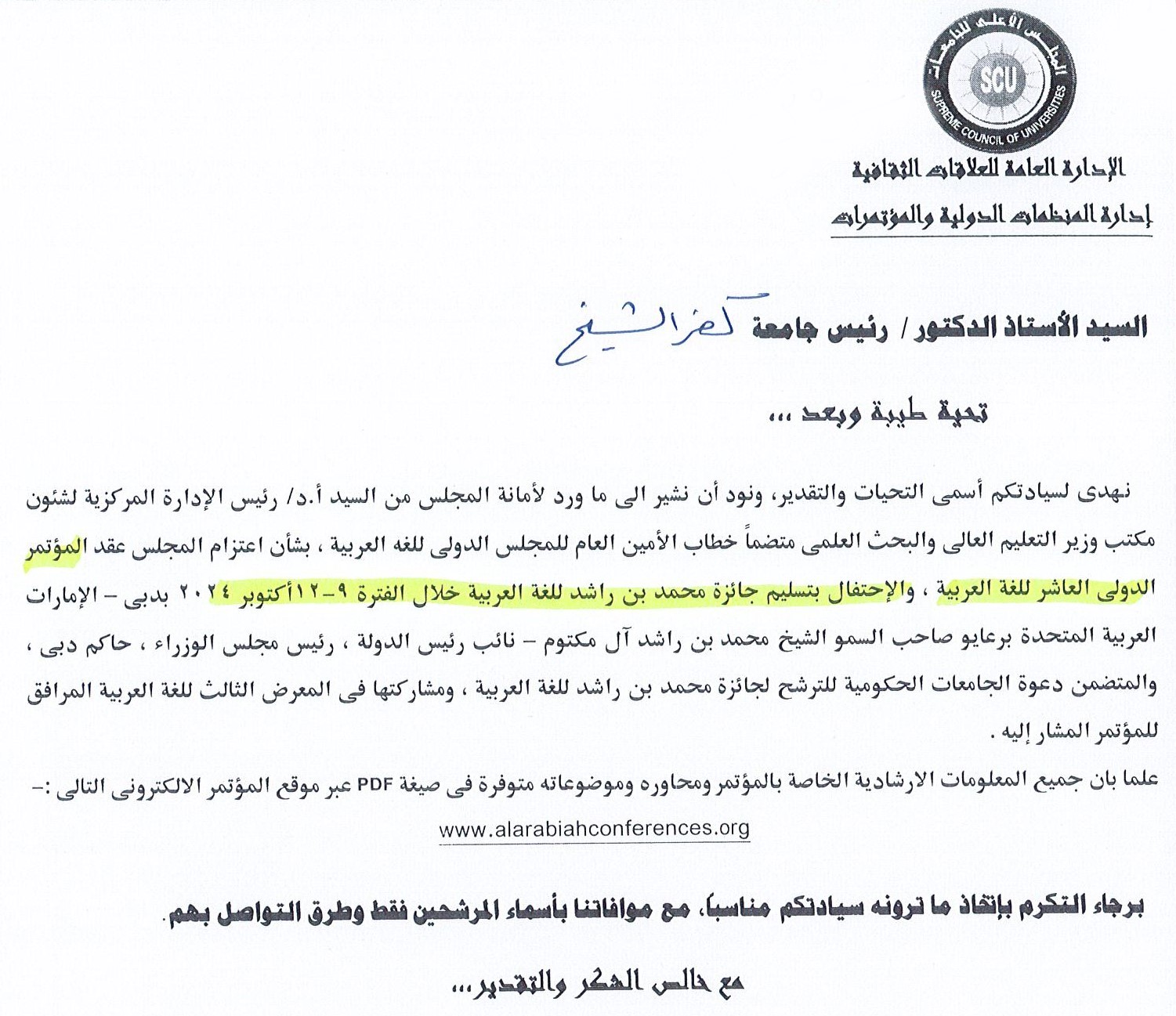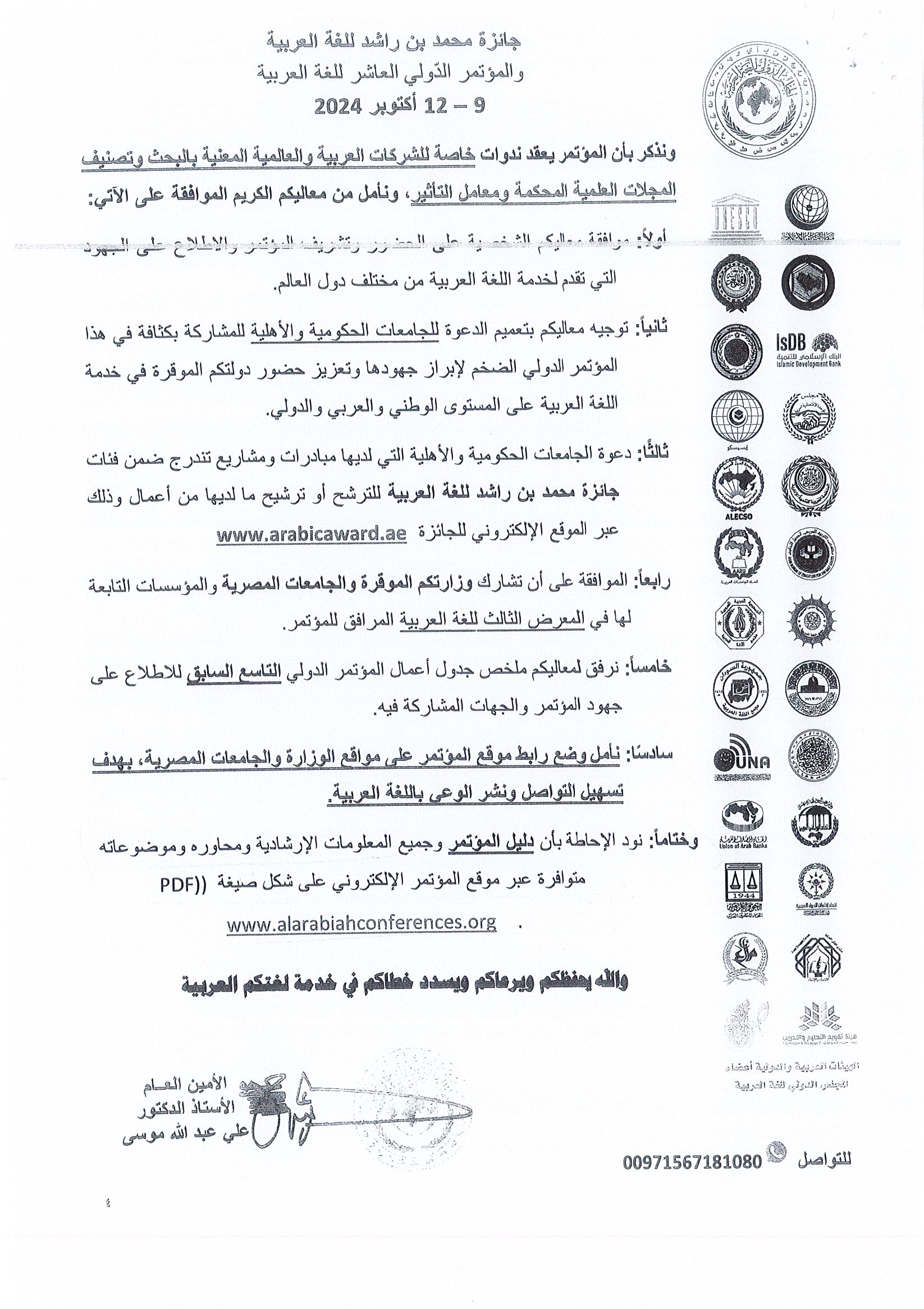إعتزام المجلس الدولى للغة العربية عقد المؤتمر الدولى العاشر للغة العربية والإحتفال بتسليم جائزة محمد بن راشد للغة العربية