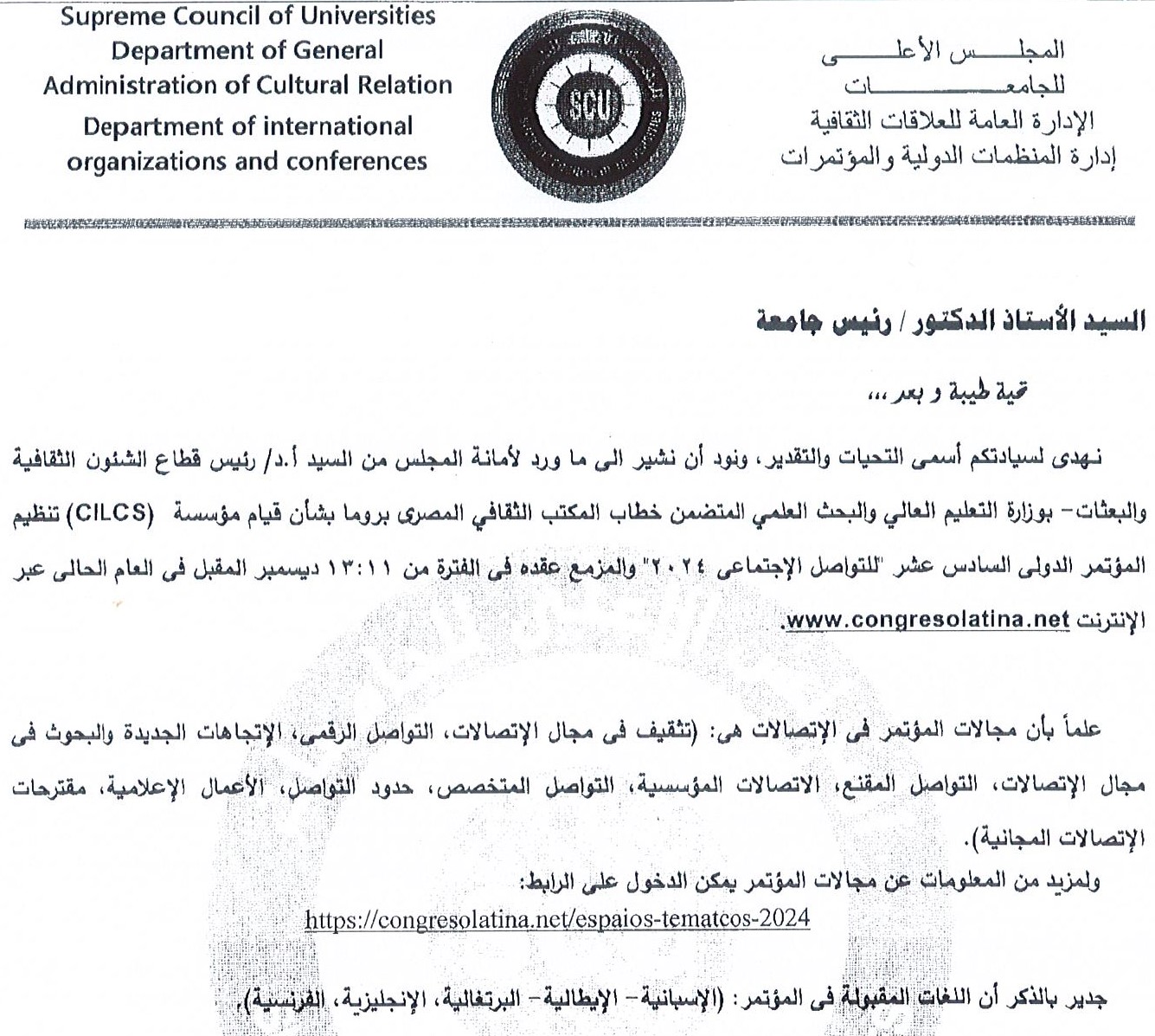 قيام مؤسسة (CILCS) تنظيم المؤتمر الدولى السادس عشر للتواصل الإجتماعي (2024) والمزمع عقده في الفترة من 11-13 ديسمبر المقبل في العام الحالي عبر الإنترنت www.congresolatina.net.