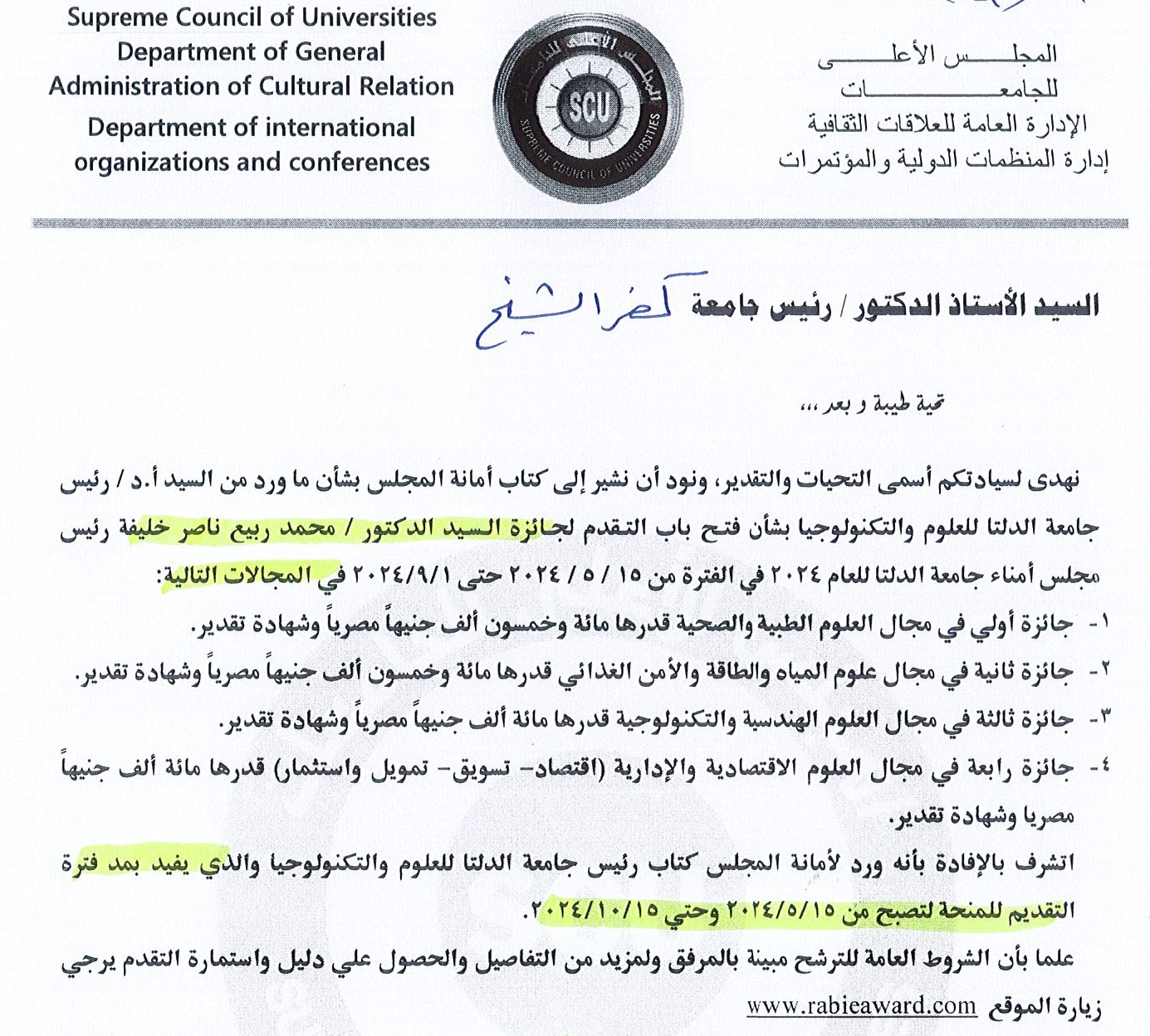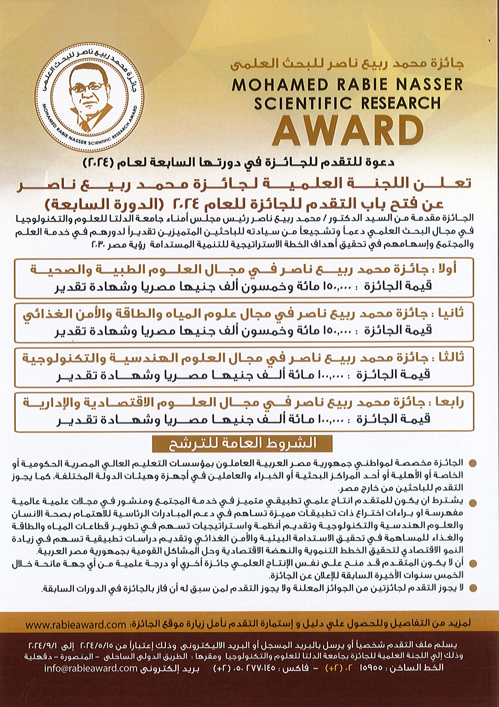 مد فترة التقدم للحصول على جائزة محمد ربيع ناصر خليفه - رئيس مجلس أمناء جامعة الدلتا - لعام ٢٠٢٤