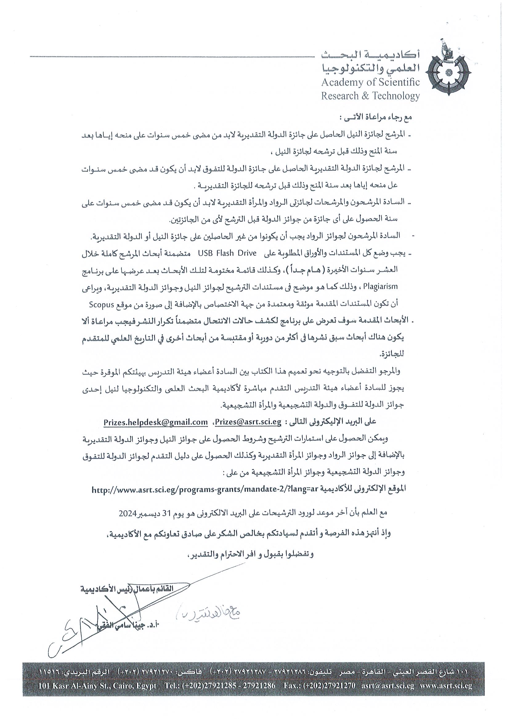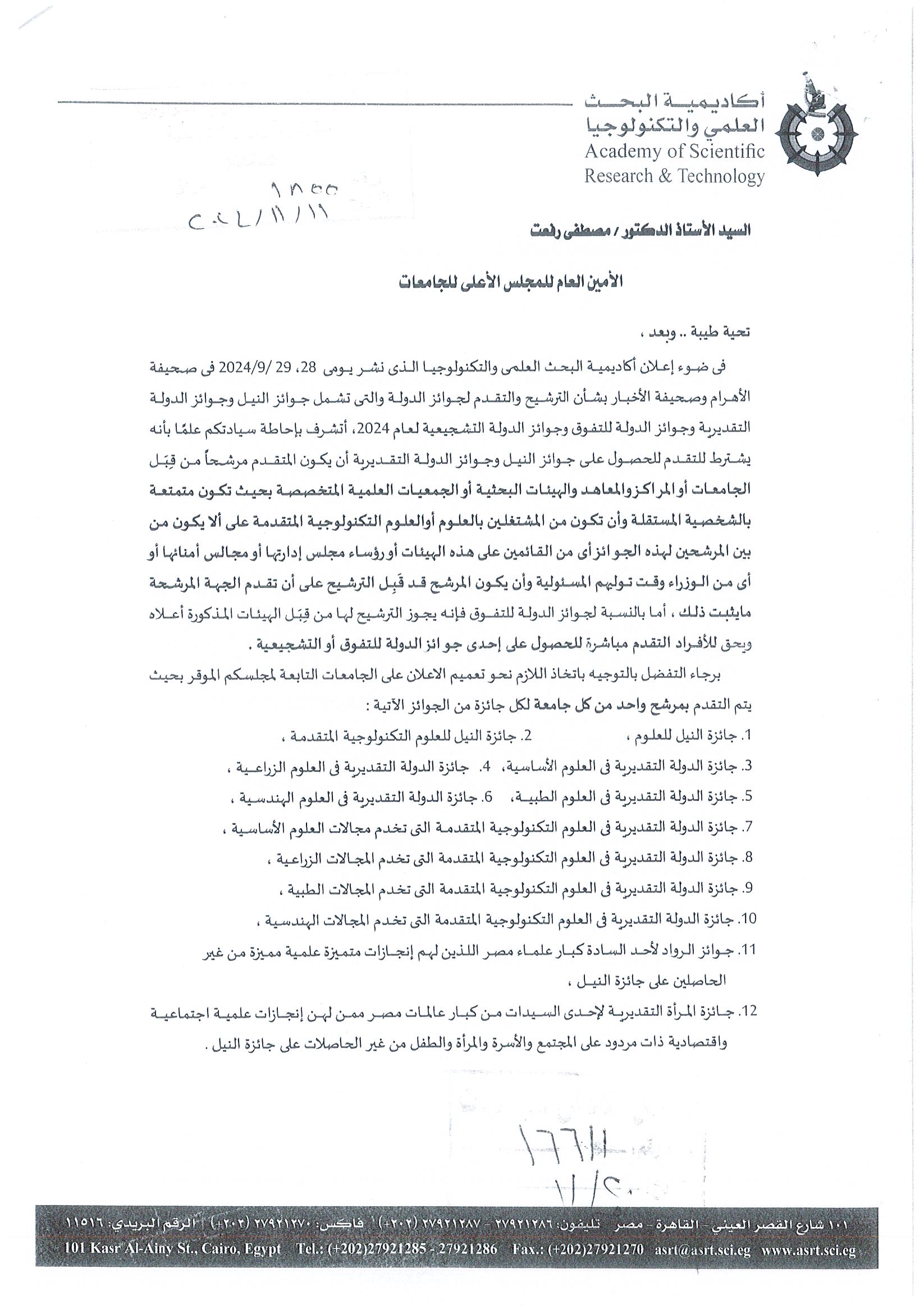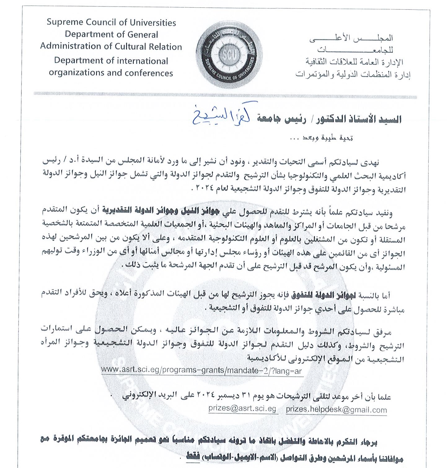 فتح باب الترشيح والتقدم لجوائز الدولة والتي تشمل جوائز النيل وجوائز الدولة التقديرية وجوائز الدولة للتفوق وجوائز الدولة التشجيعية لعام ٢٠٢٤م