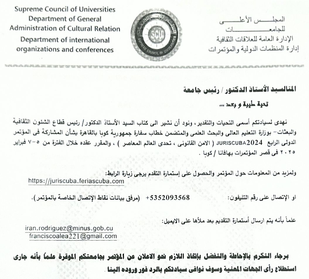 المؤتمر الدولي الرابع JURISCUBA 2024 (الأمن القانونى ، تحدى العالم المعاصر)