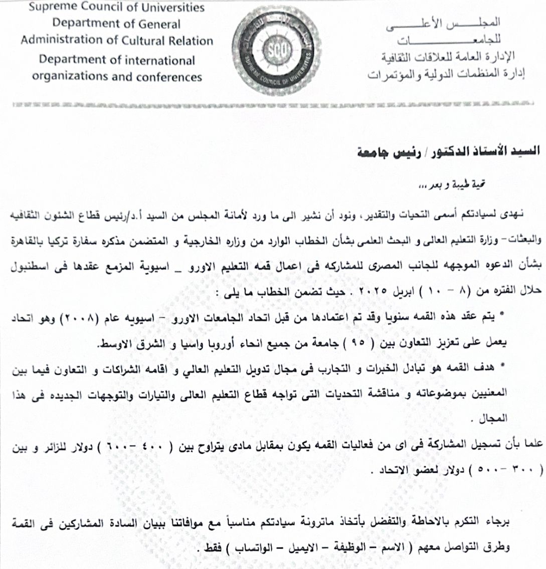 اعمال قمه التعليم الاورو - اسيوية المزمع عقدها في اسطنبول خلال الفترة من (۸ - ۱۰) ابريل 2025