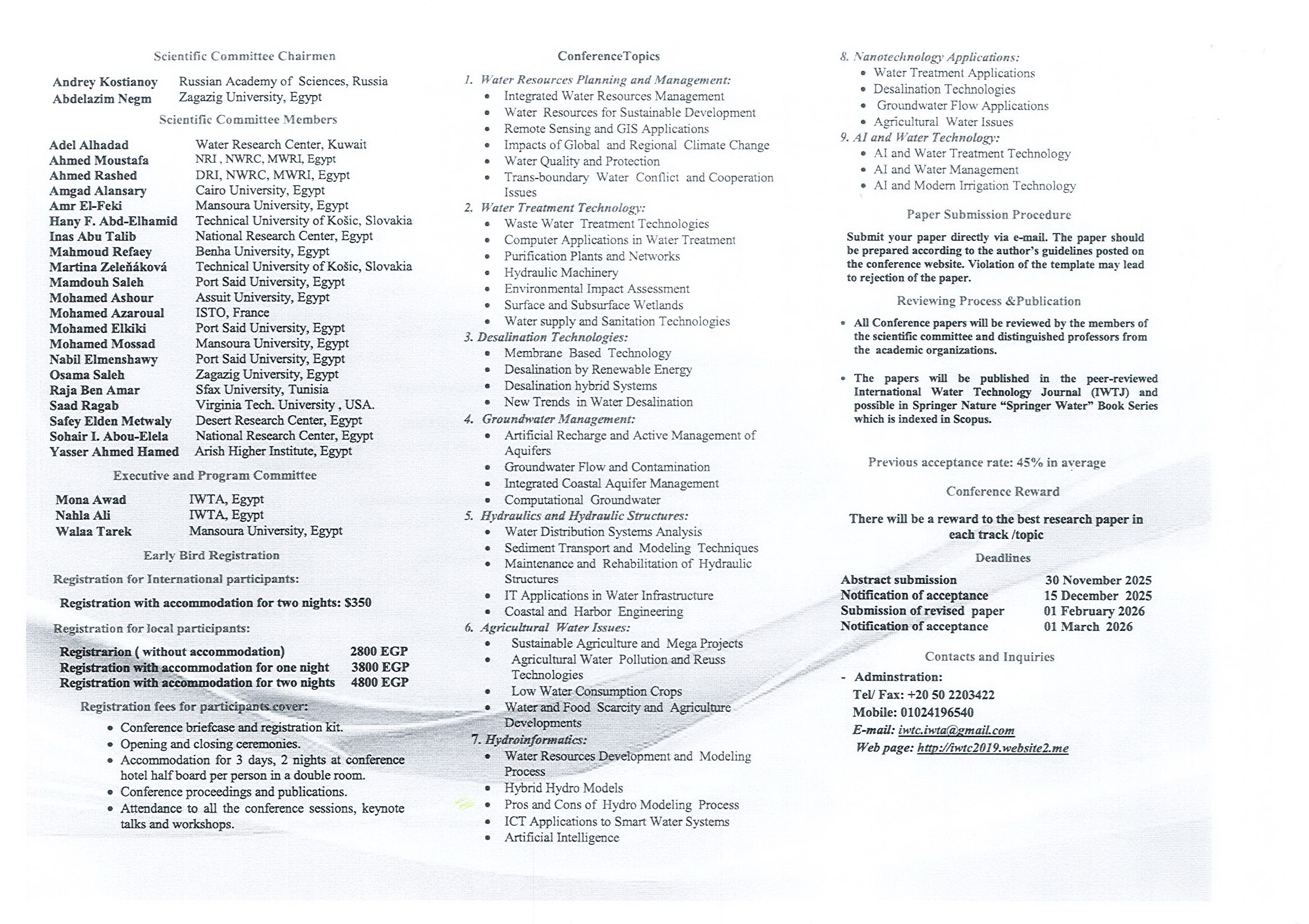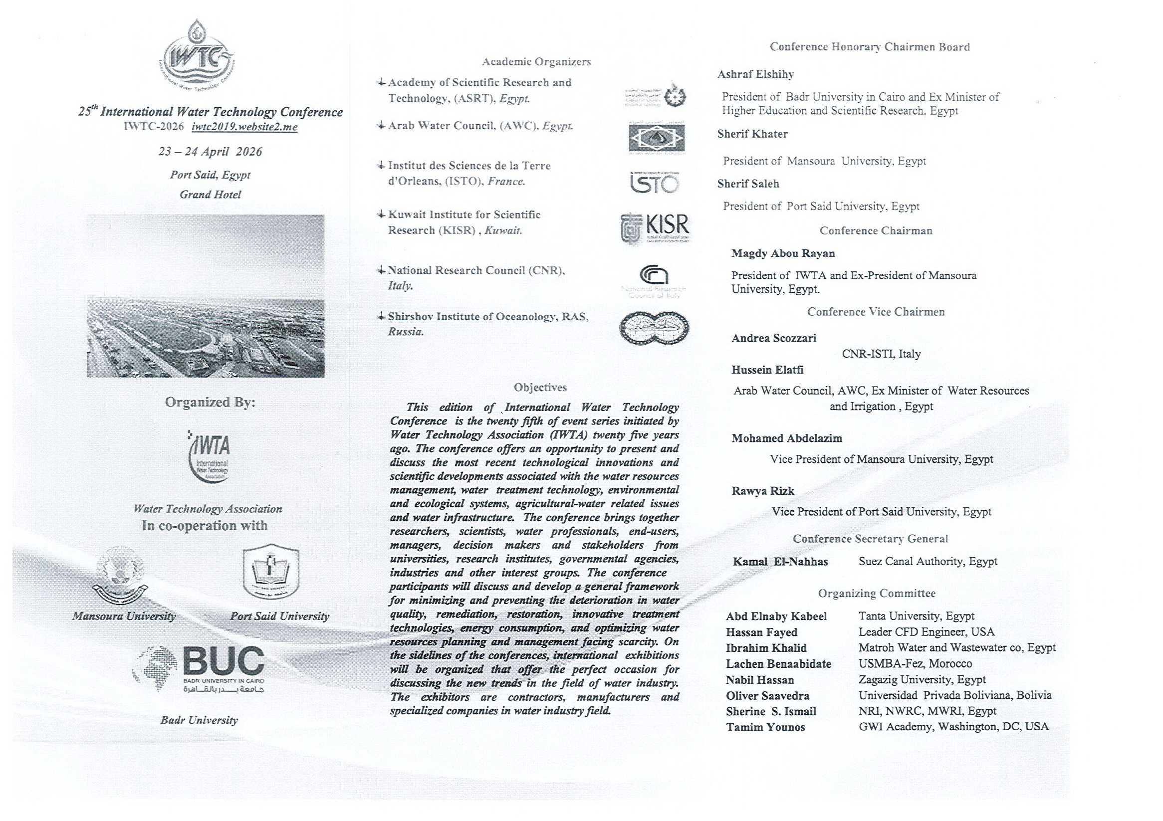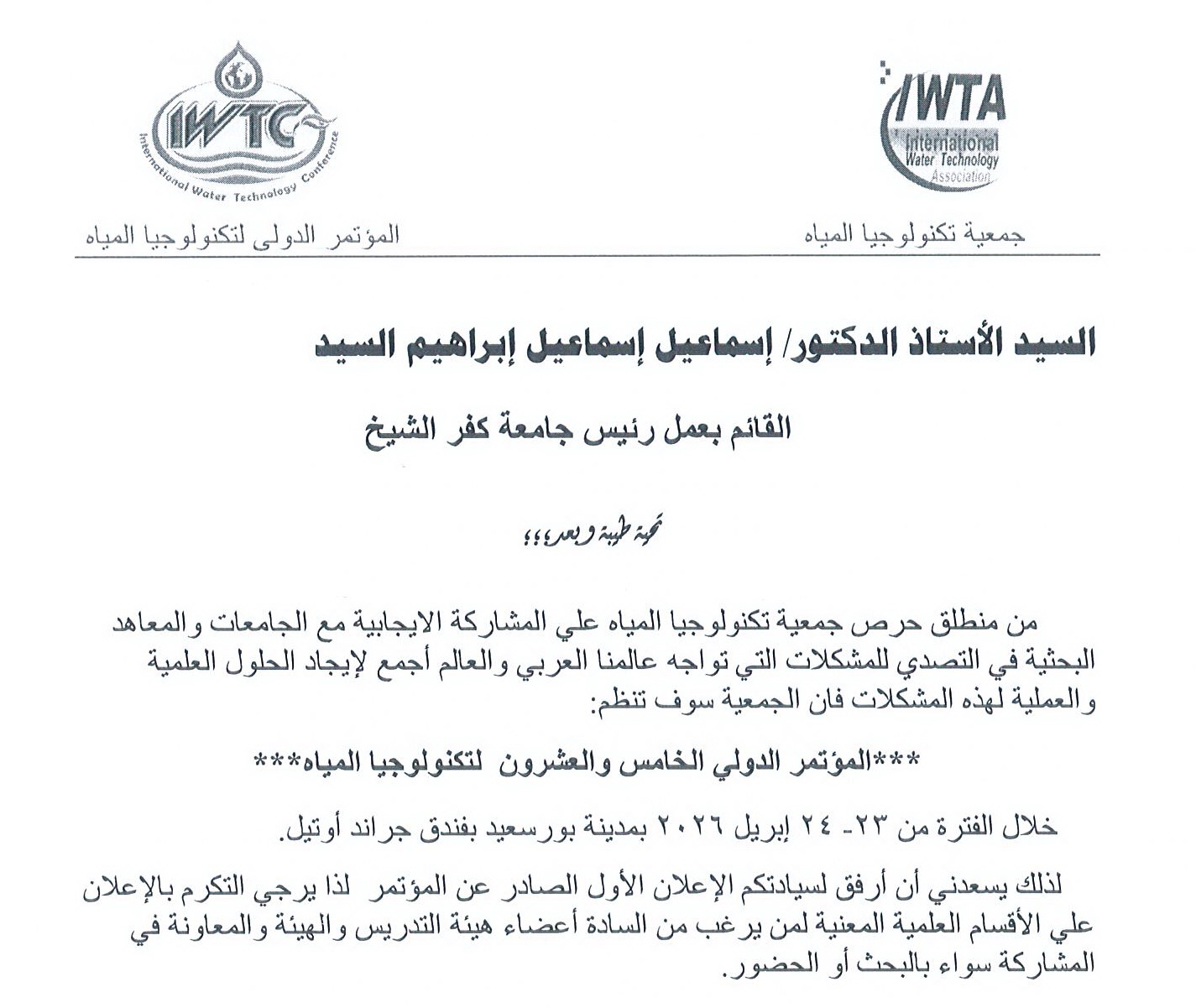 جمعية تكنولوجيا المياه سوف تنظم "المؤتمر الدولي الخامس والعشرون لتكنولوجيا المياه" خلال الفترة من ٢٤ -٢٣ إبريل ٢٠٢٦