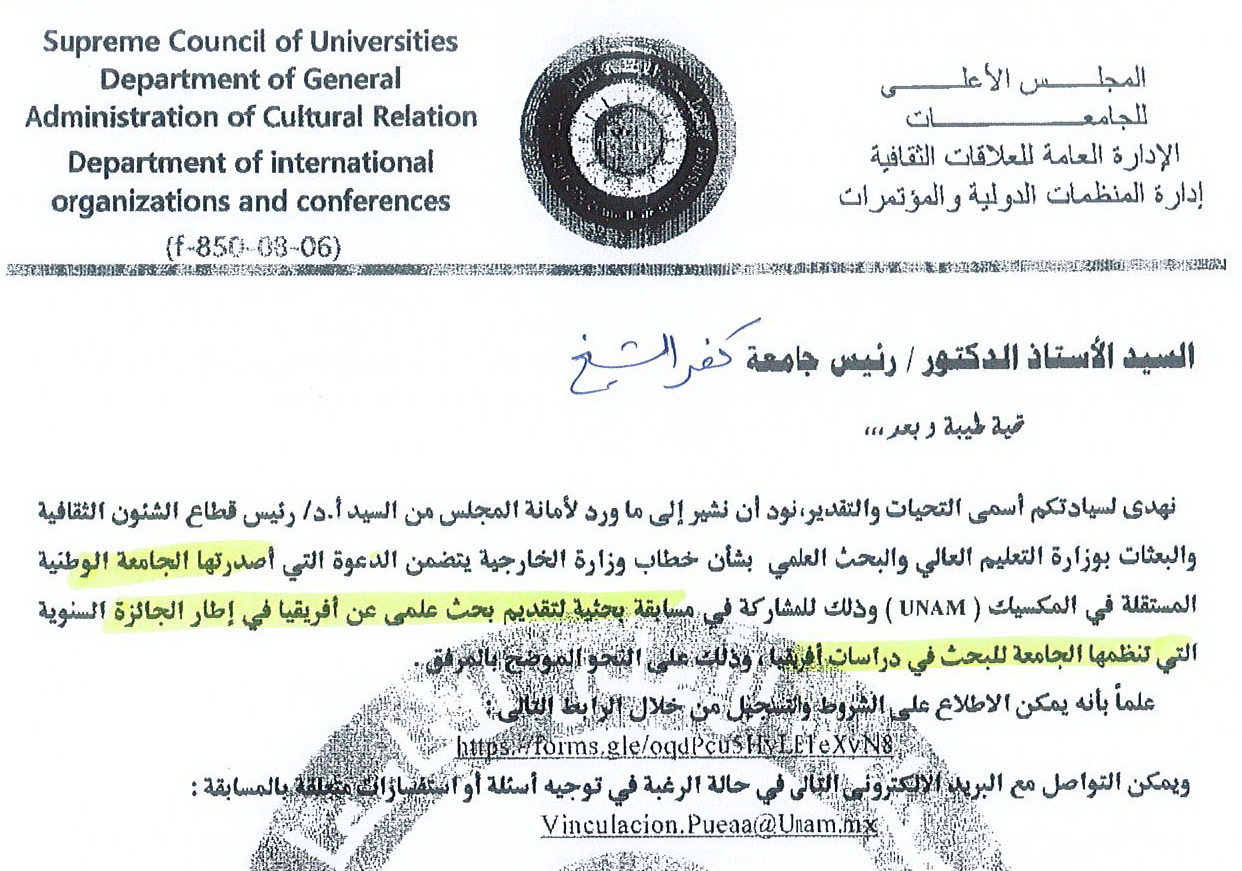 تنظم الجامعة الوطنية المستقلة في المكسيك (UNAM) مسابقة بحثية في اطار الجائزة السنوية التي تنظمها الجامعة في دراسات أفريقيا