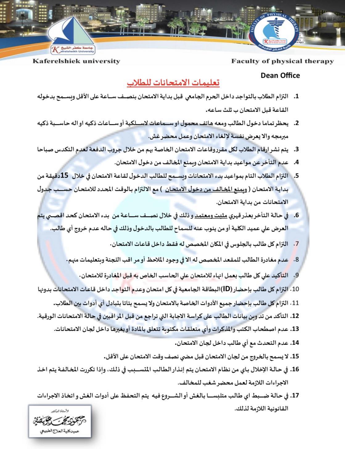 خريطة الامتحانات الالكترونية بكلية العلاج الطبيعى للفصل الخريفى 2025/2026
