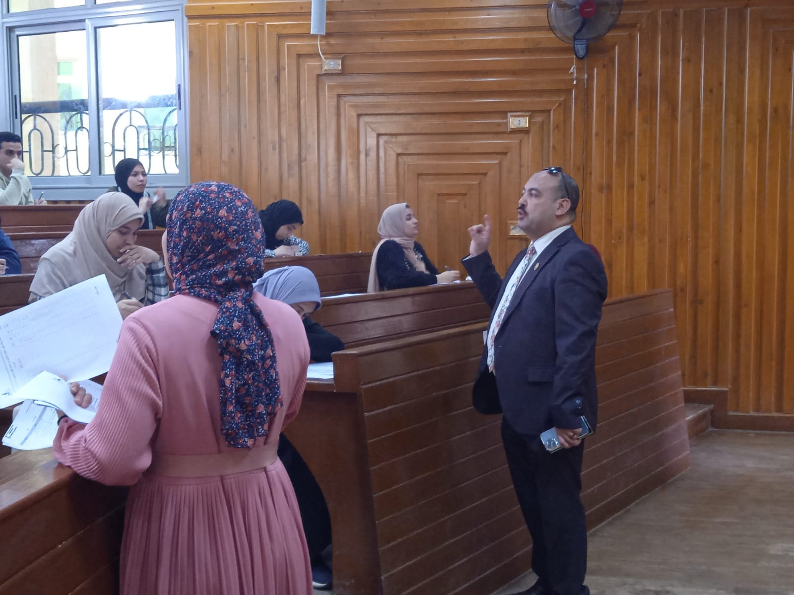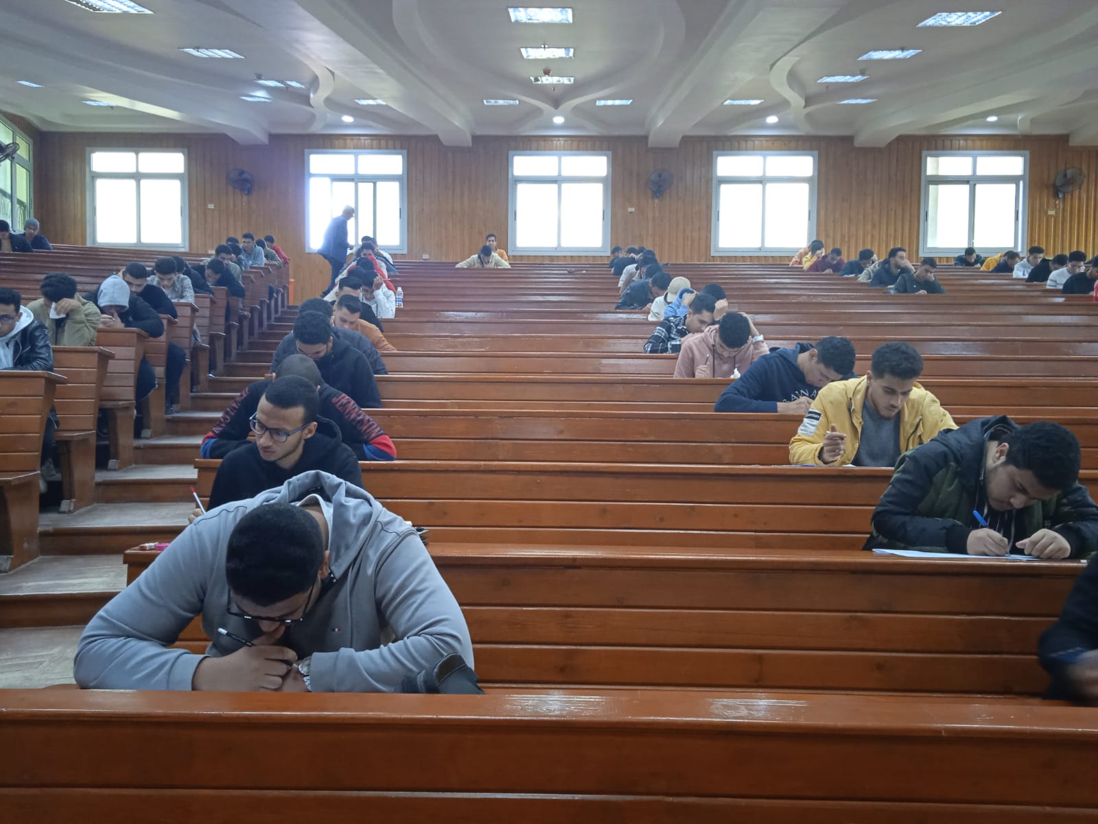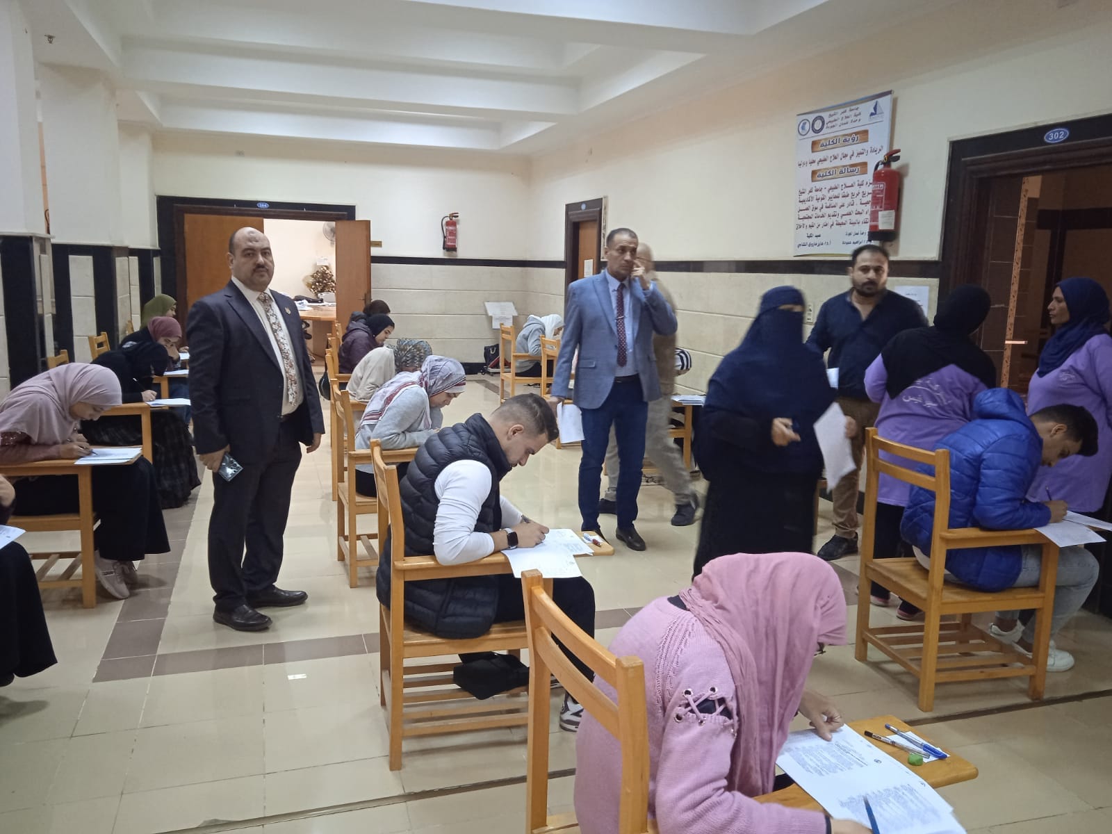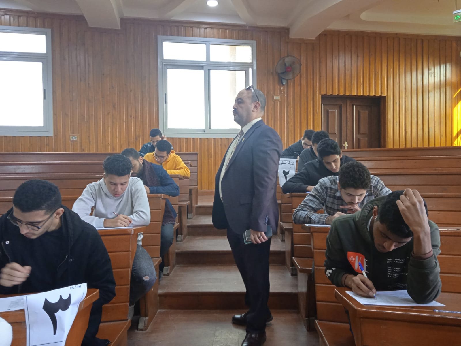 وقد قام السيد أ.د/ فايز الشامى عميد الكلية و أ.د/ محمود عويضة وكيل الكلية لشئون التعليم والطلاب بالمرور على لجان الامتحانات بالكلية والمدرجات المركزية للاطمئنان على الطلاب و التأكد من حسن سير الامتحان