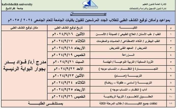 مواعيد الكشف الطبى للطلاب الجدد