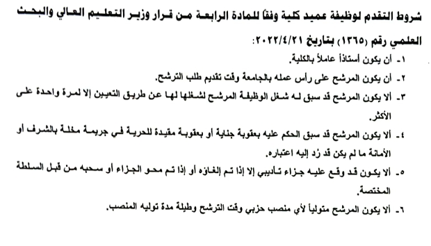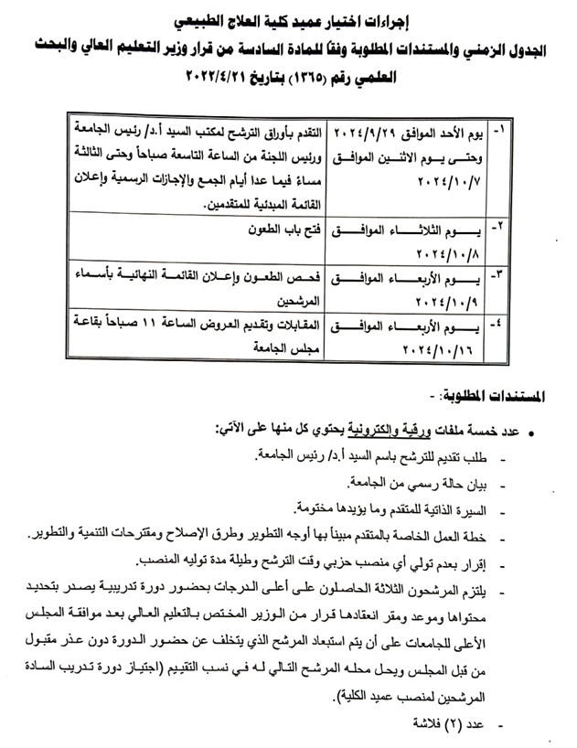 علي السادة أعضاء هيئة التدريس ممن لهم حق الترشح لمنصب عميد كلية العلاج الطبيعي وفقاً للقرار الوزاري رقم 1365 بتاريخ 21/4/2.22 وذلك حسب الجدول الزمني والمستندات المطلوبة وشروط الترشح