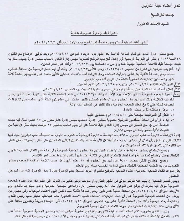 دعوة لعقد جمعية عمومية عادية لنادي اعضاء هيئة التدريس جامعة كفر الشيخ الاحد 1 ديسمبر