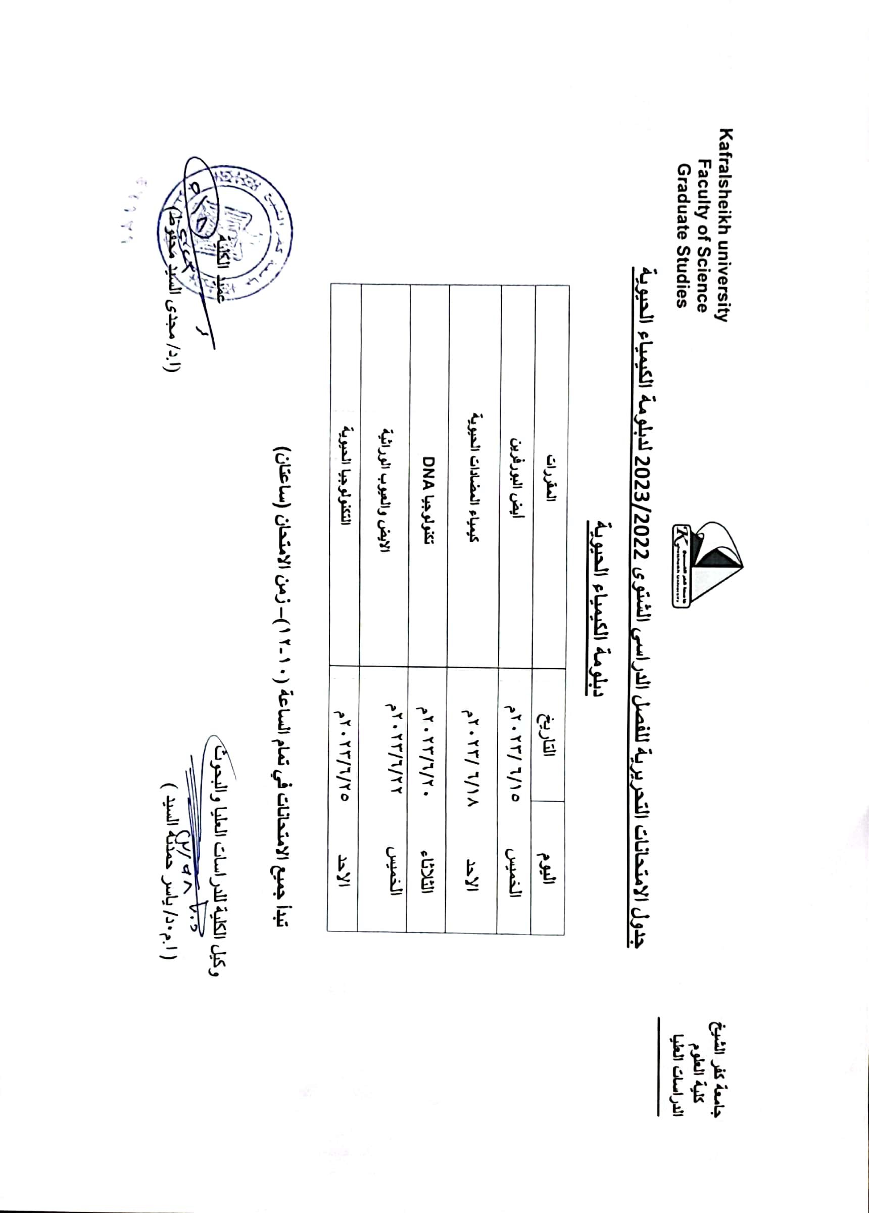 جدول الامتحانات النظرية لدبلوم الكيمياء الحيوية للفصل الشتوى ٢٠٢٢/٢٠٢٣