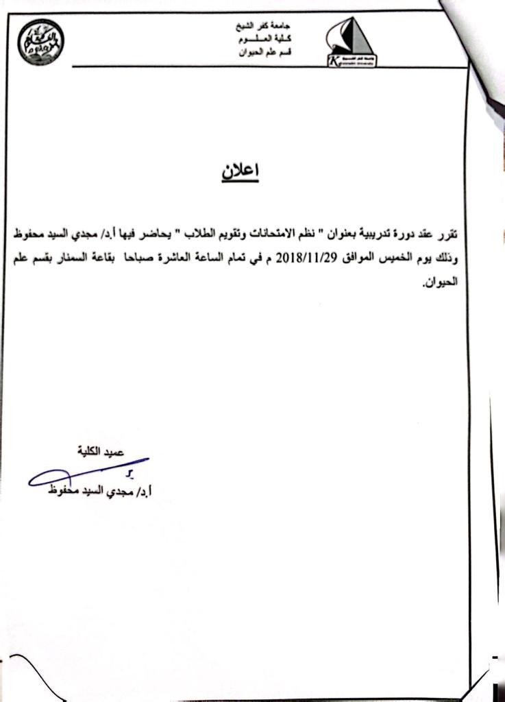 اعلان عن دورة تدريبية بعنوان (نظم الامتحانات وتقويم الطلاب)