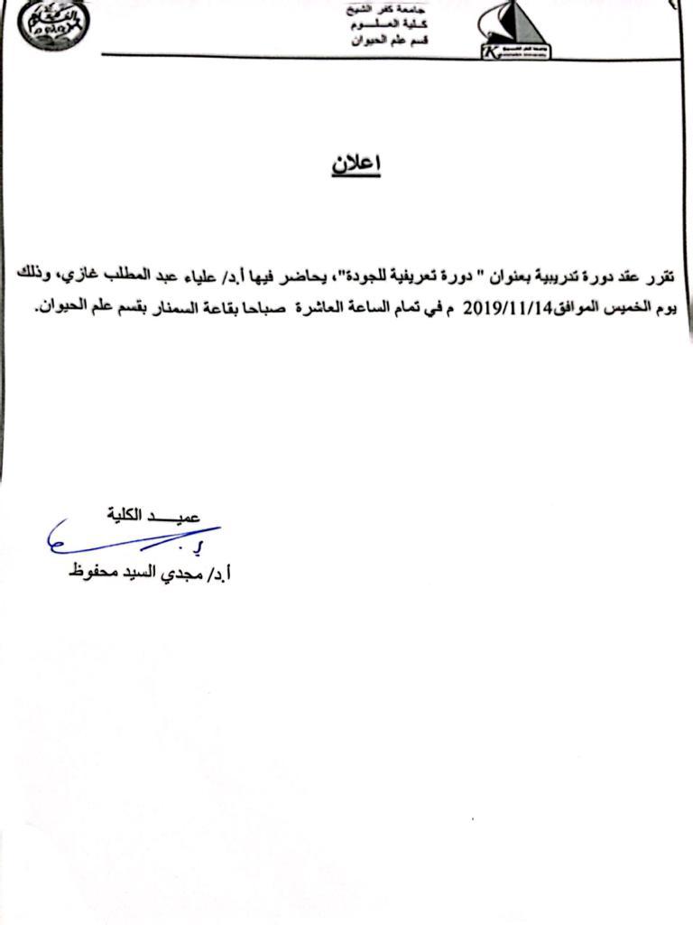 اعلان عن دورة تدريبية بعنوان (دورة تعريفية للجودة)