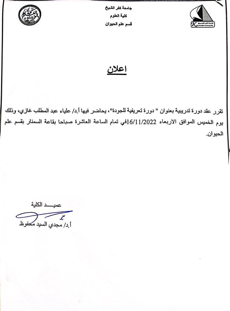اعلان عن دورة تدريبية بعنوان (دورة تعريفية للجودة)