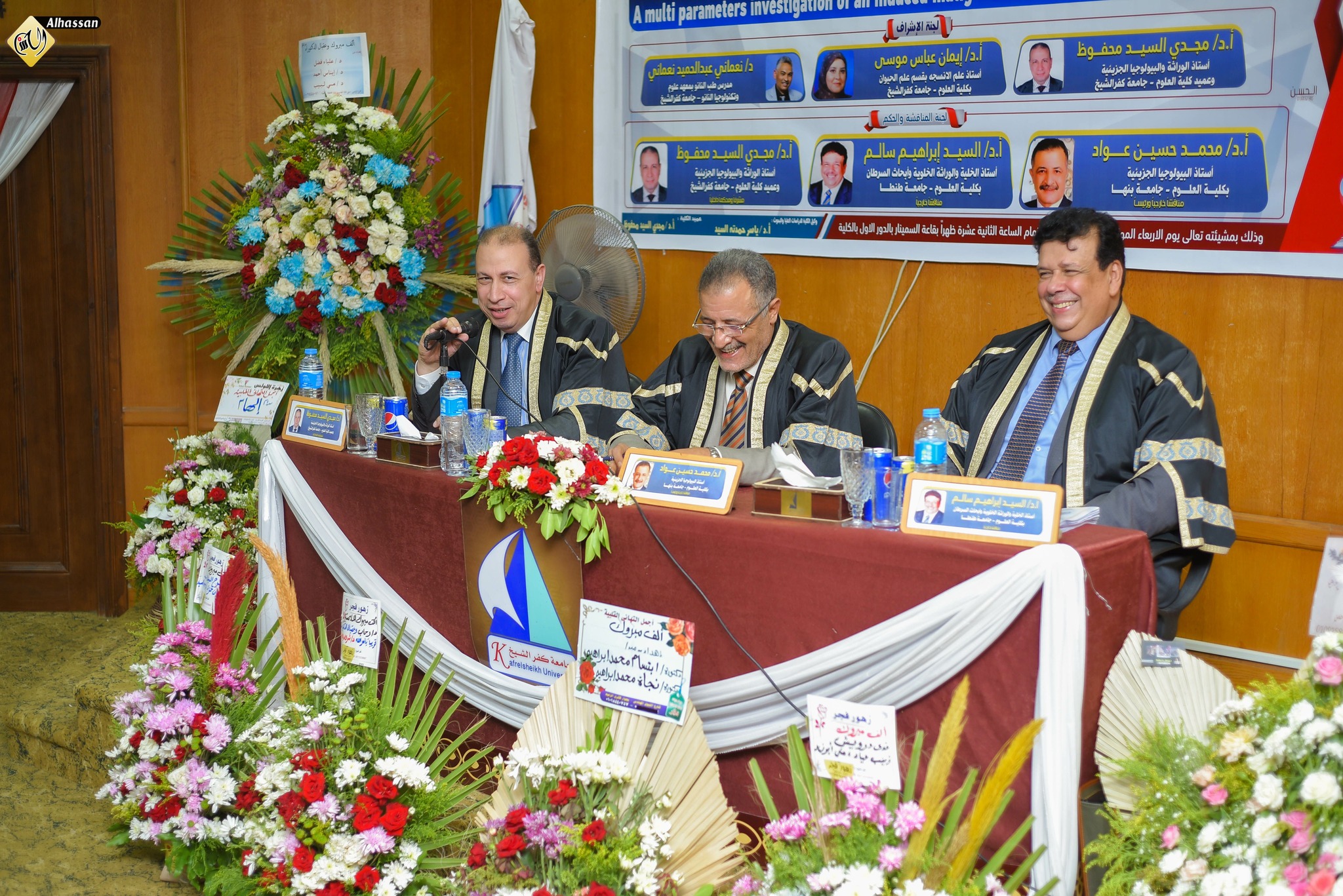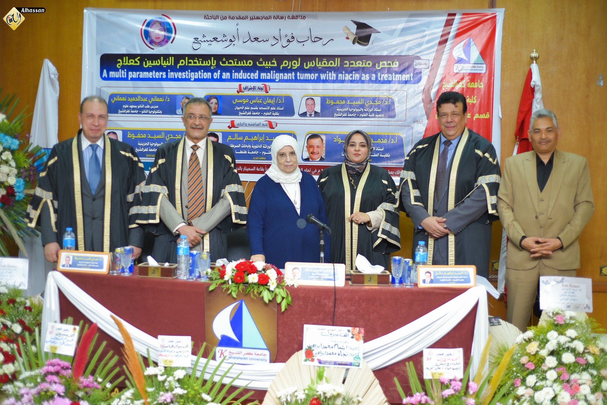 يتقدم السيد الاستاذ الدكتور / مجدى السيد محفوظ عميد الكلية والسيد الاستاذ الدكتور / ياسر حمدته وكيل الكلية للدراسات العليا والبحوث والسيد الاستاذ الدكتور /عبدالحميد الشاعر وكيل الكلية لشئون التعليم والطلاب والسيد الاستاذالدكتور / احمد عباده وكيل الكلية لخدمة المجتمع وتنمية البيئة والسيد الاستاذ /اسماعيل ابواليزيد امين الكلية والسادة اعضاء هيئة التدريس والسادة اعضاء الجهاز الادارى بالكلية بخالص التهانى والتبريكات للباحثة (رحاب فؤاد سعد .ابوشعيشع ) بقسم علم الحيوان لحصولها على درجة الماجستير