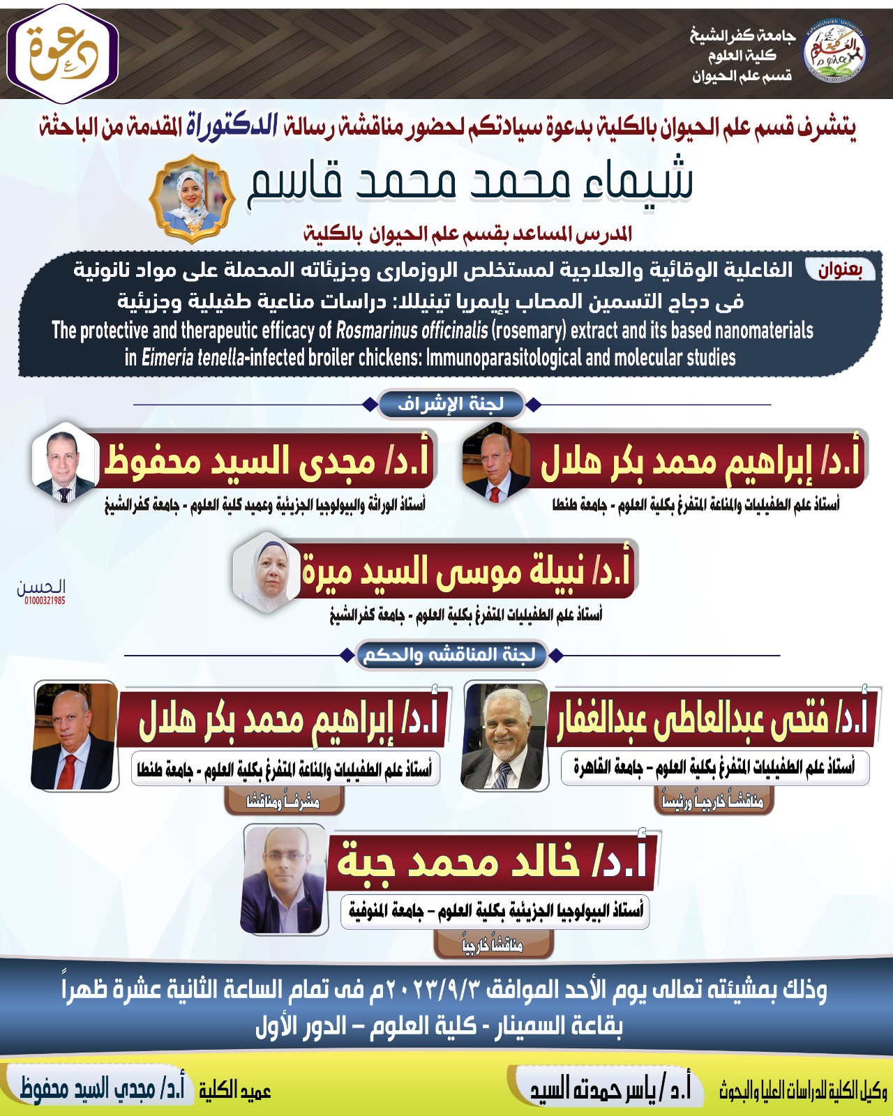 دعوة عامة (لحضور مناقشة رسالة الدكتوراه الخاصة بالباحثة / شيماء محمد محمد قاسم )المدرس المساعد بقسم علم الحيوان بالكلية