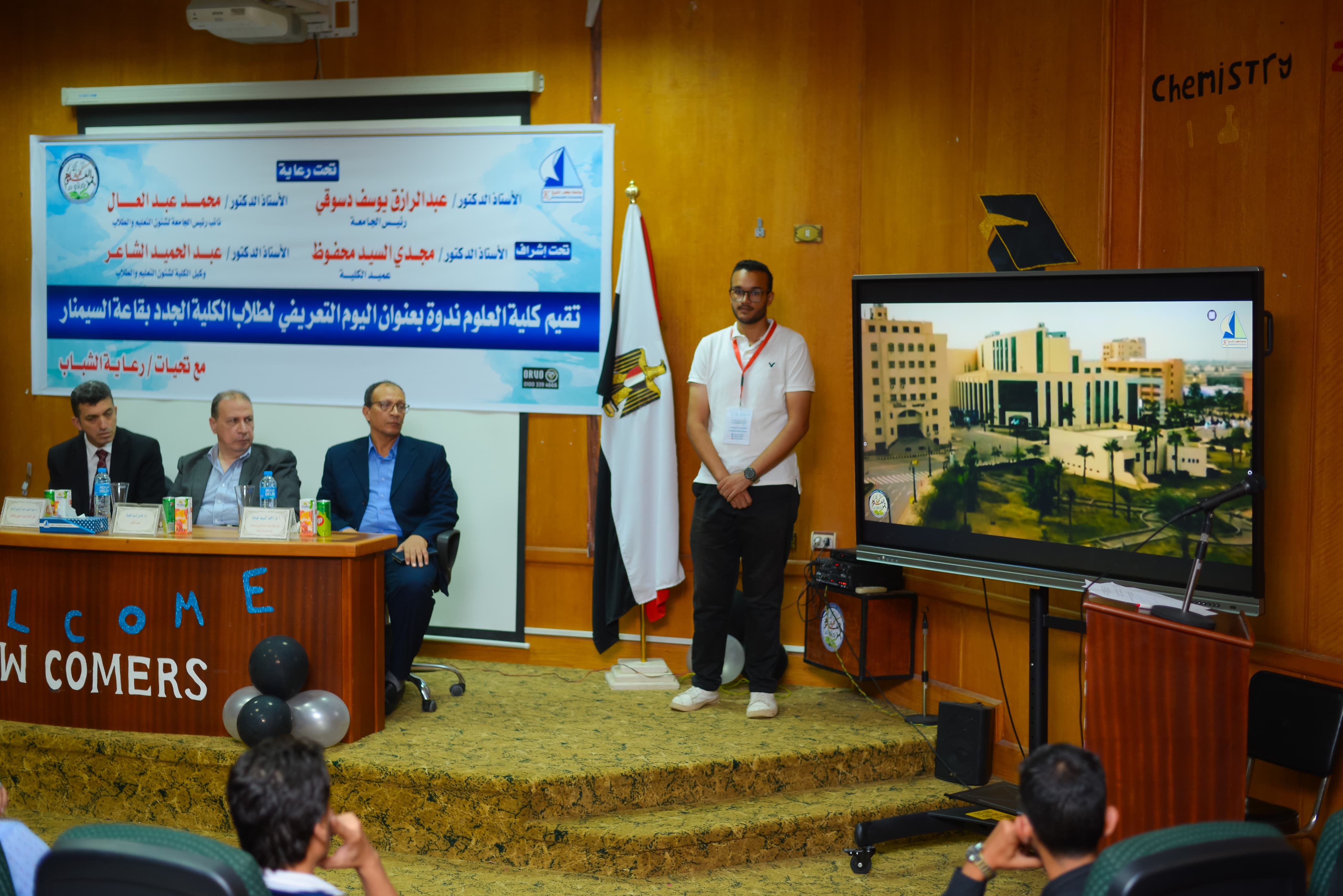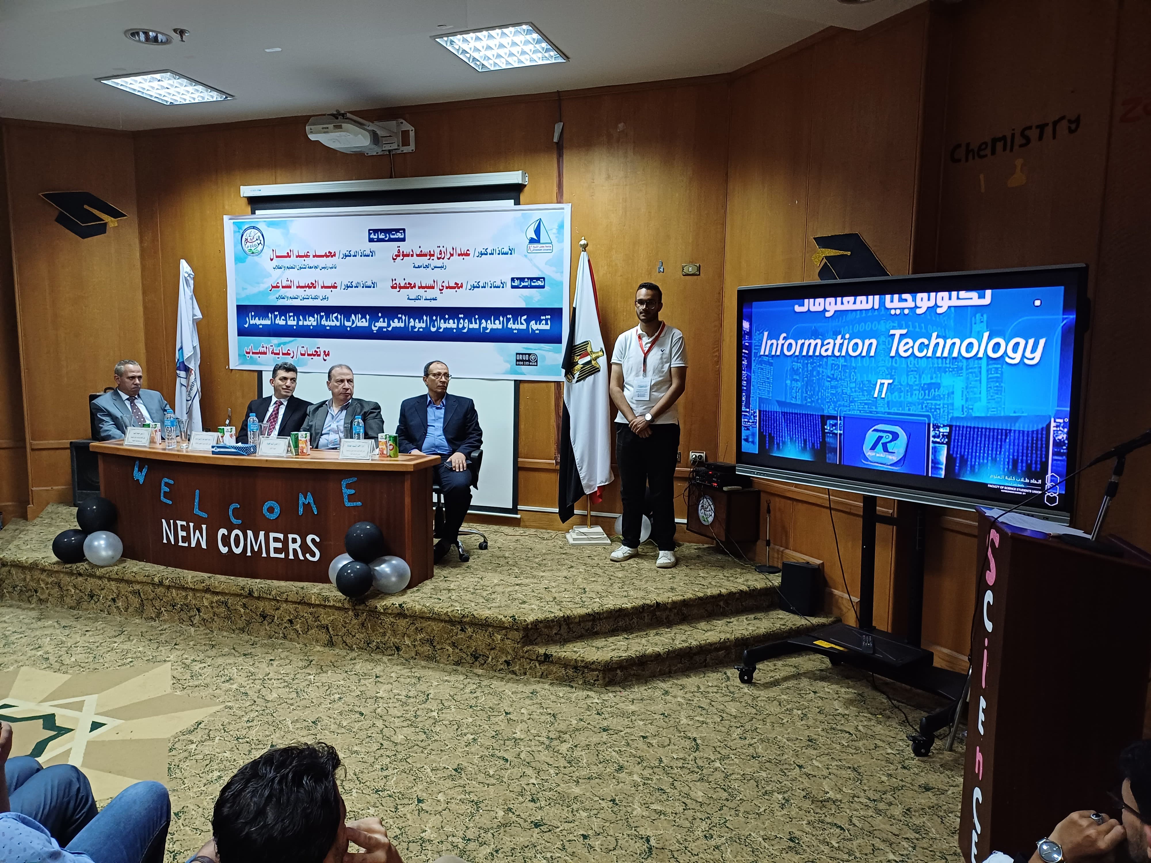 قامت كلية العلوم اليوم الاثنين الموافق3/10/2023باقامة يوم تعريفى للطلاب الجدد بالكلية وقد القى السيد الاستاذ الدكتور / مجدى محفوظ عميد الكليه كلمته للطلاب الجدد حيث قام بالترحيب بهم وحثهم على ضرورة تواجد القيم والاخلاق التى يجب ان يتصف بها منسوبى كلية العلوم لكى يكون باحث علمى متفوق ومتميز يخدم البحث العلمى والبشرية واكد على ضرورة التواصل بينهم وبين ادارة الكلية لتقديم الحلول لأى عقبات تعوق العملية التعليمية .كما قام السيد الاستاذ الدكتور / عبدالحميد الشاعر وكيل الكلية لشئون التعليم والطلاب بالقاء كلمة للطلاب بدأها بالترحيب بهم موضحا لهم لأئحة الكلية والبرامج الموجودة بالكلية ونظام الساعات المعتمدة و اهمية الانشطة الطلابية والمشاركة فيها . كما قام السيد الاستاذ الدكتور /ياسر حمدته وكيل الكلية للدراسات العليا والبحوث والقى كلمه للطلاب موضحا اهمية الدراسات العليا لطالب كلية العلوم واهمية البحث العلمى.كما قام السيد الاستاذ الدكتور / احمد السيد عباده وكيل الكلية لخدمة المجتمع وتنمية البيئةواكد على ضرورة اكتساب المهارات العلمية والعملية التى تؤهلهم لسوق العمل .وايضا قام السيد الاستاذ الدكتور / وليد اسماعيل منسق الانشطة الطلابية بالكلية بأهمية اشتراك الطلاب بالانشطة الطلابية والمنصات العلمية مثل منصة ثنكى التعليمية وضرورة التسجيل فيها.وايضا قامت المهندسة / ناهد رمضان مسئول الخدمات الالكترونية بالكلية بتوضيح كيفية التسجيل فى الساعات المعتمدة وكيفية التسجيل على منصة ثنكى واهمية المنصات العلمية للطلاب. وايضا قام الاستاذ / طارق الخطيب رئيس شئون الطلاب بتوضيح عملية التشعيب الداخلى للطلاب و البرامج المتاحة فى الكلية وكيفية التحويل من قسم الى قسم اخر بالكلية و توضيح كافة التساؤلات للطلاب الجدد.متمنيين للطلاب الجدد دوام التقدم والتوفيق