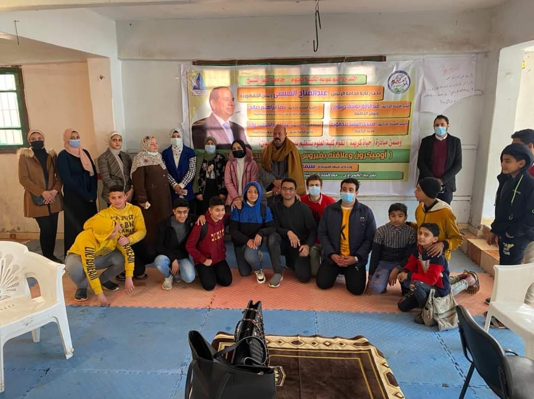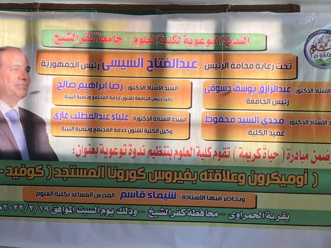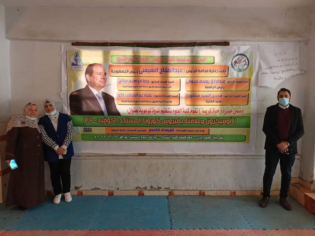 قامت اليوم السبت الموافق 19/2/2022 بندوة توعوية بعنوان (اوميكرون وعلاقته بفيروس كورونا المستجد (كوفيد-19)) ضمن مبادرى حياة كريمة وحاضر فيها الاستاذة / شيماء قاسم المدرس المساعد بقسم علم الحيوان بالكلية بقرية الحمراوى بمحافظة كفر الشيخ.