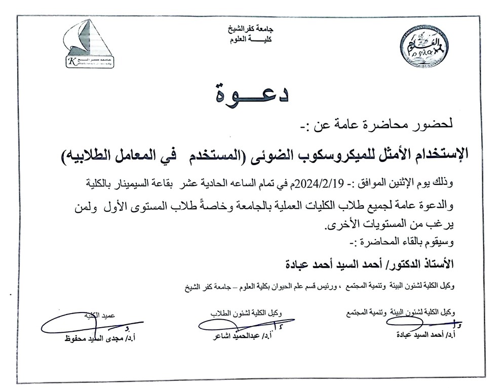 دعوة عامة (لحضور محاضرة عامة عن الاستخدام الامثل للميكروسكوب الضوئى (المستخدم فى المعامل الطلابية)