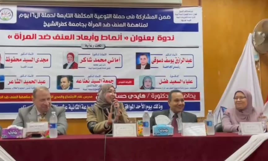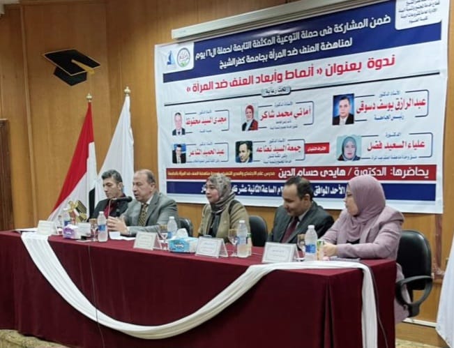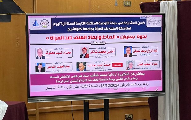 إنه في يوم الأحد الموافق 15/12/2024 الساعة الثانية عشر ظهرا عقدت كلية العلوم جامعة كفرالشيخ ندوة توعوية بعنوان " أنماط وأبعاد العنف ضد المرأة " حاضر فيها معالى الأستاذ الدكتور/ داليا محمد خطاب – أستاذ علم النفس الإكلينيكي المساعد وعضو الدعم النفسي بوحدة مناهضة العنف ضد المرأة والمنسق العام للوحدة بجامعة كفرالشيخ وذلك بحضور كلا من :