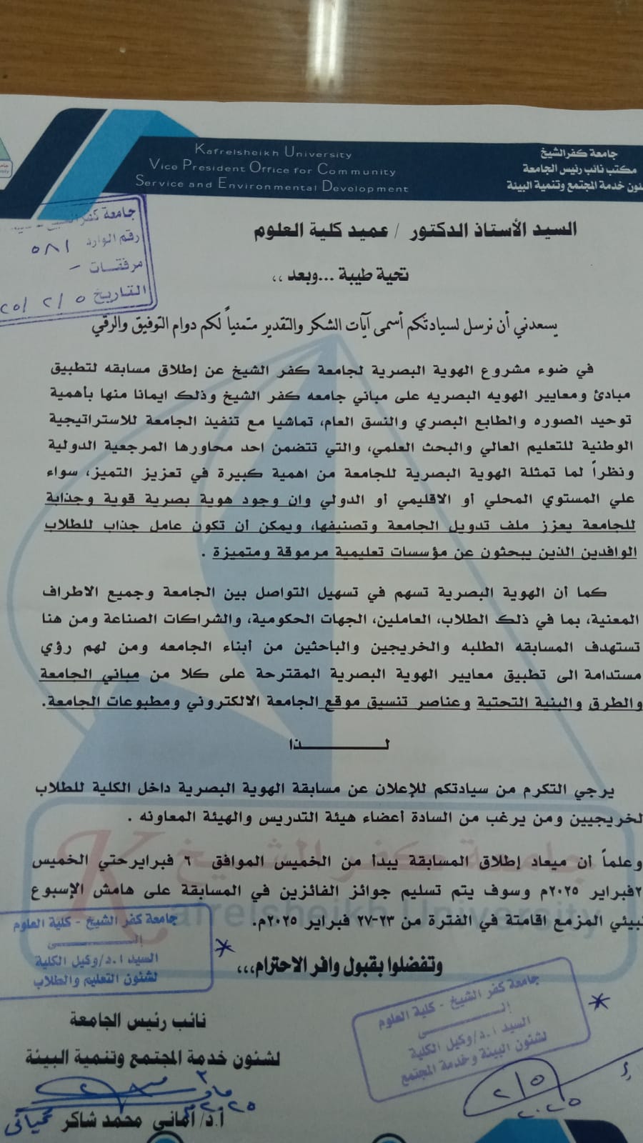 اطلاق مسابقة لتطبيق مبادىء ومعايير الهوية البصرية على مبانى جامعة كفرالشيخ