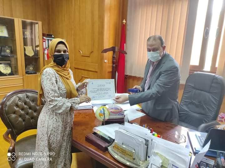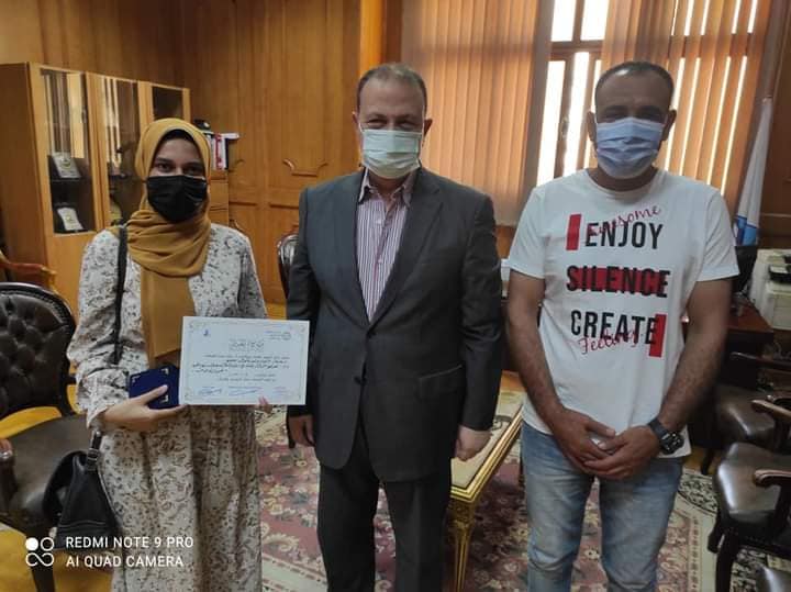 حيث استمع سيادتة لحديث الطالبة عن موضوع البحث والأفكار المقدمة من خلالة وحثها على بذل المزيد من الجهد ومواصلة التفوق . وقام سيادتة بتكريم الطالبة بتقديم شهادة تقدير ودرع الكلية تقديرا لها ولتفوقها.