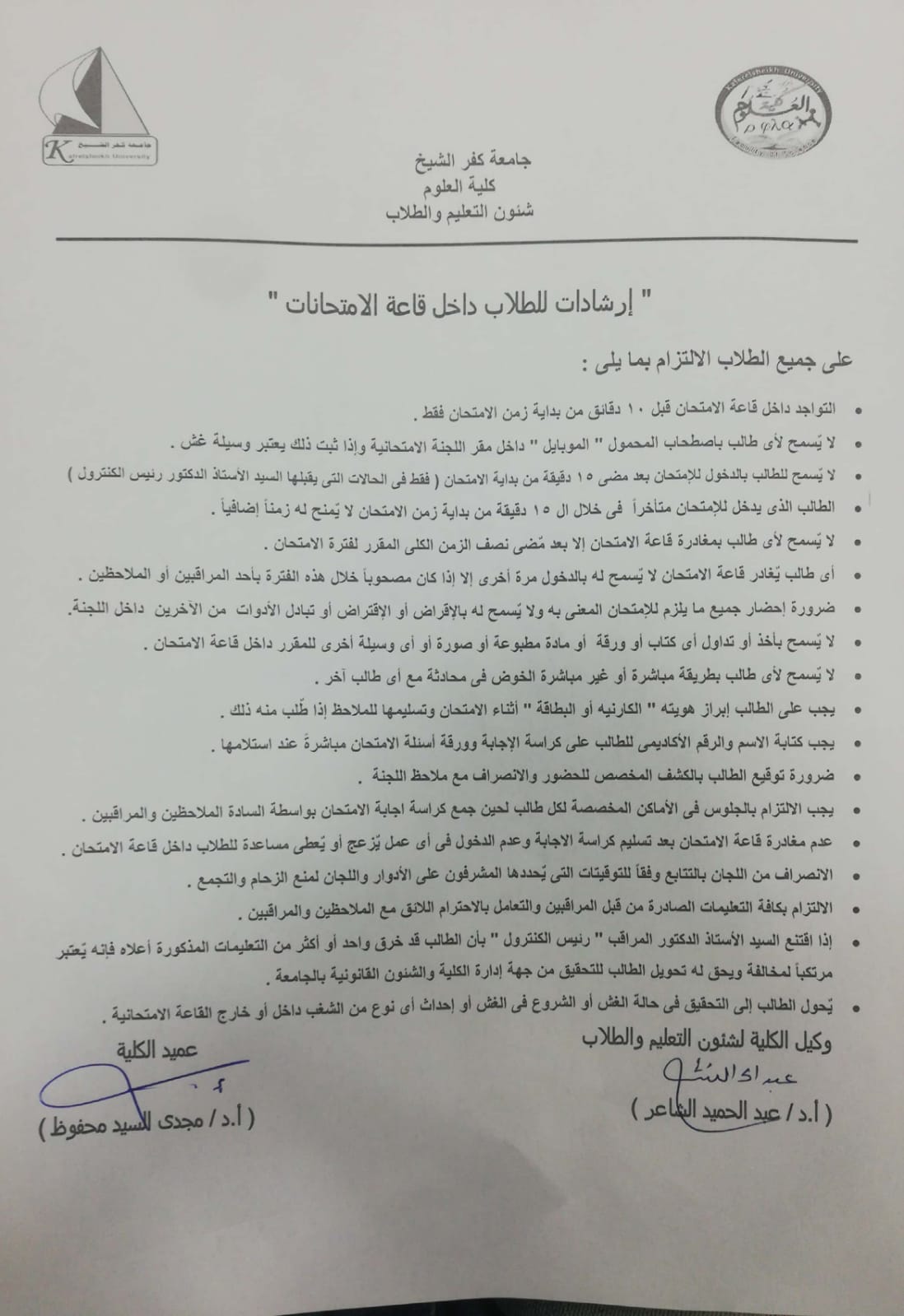 الارشادات العامة للطلاب داخل قاعة الامتحانات