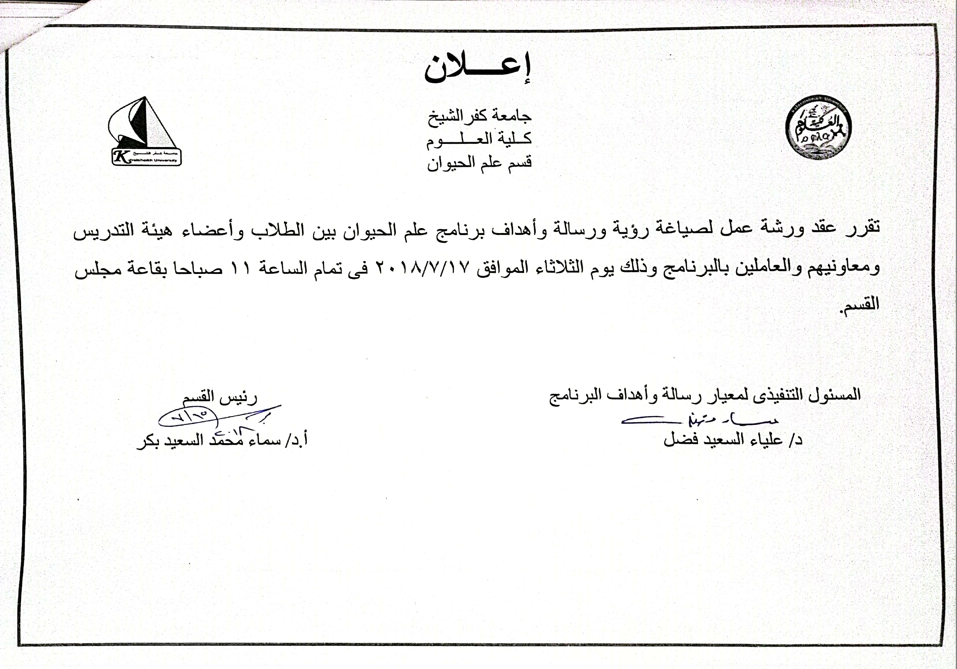 ورشة عمل لصياغة رؤية ورسالة واهداف برنامج علم الحيوان