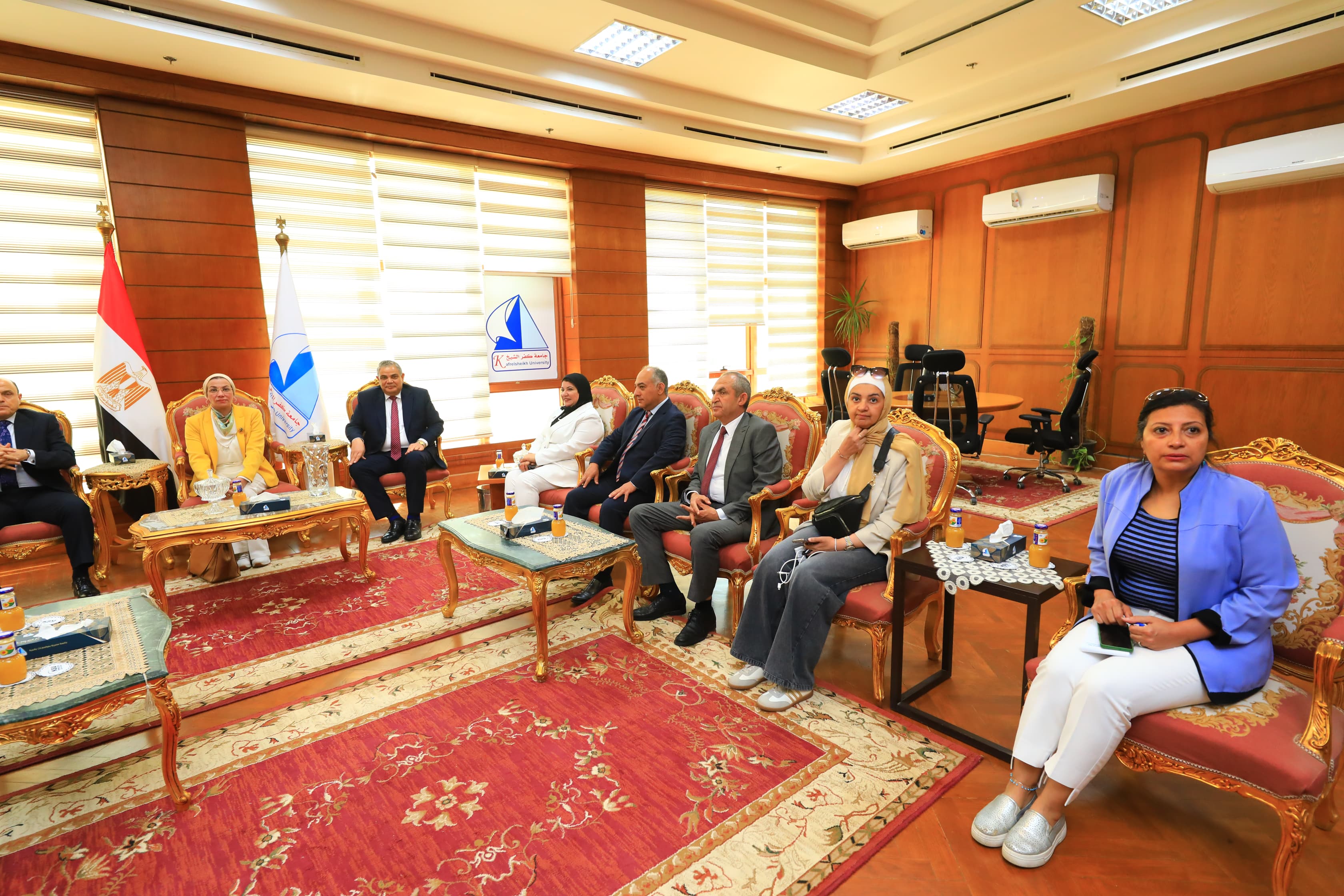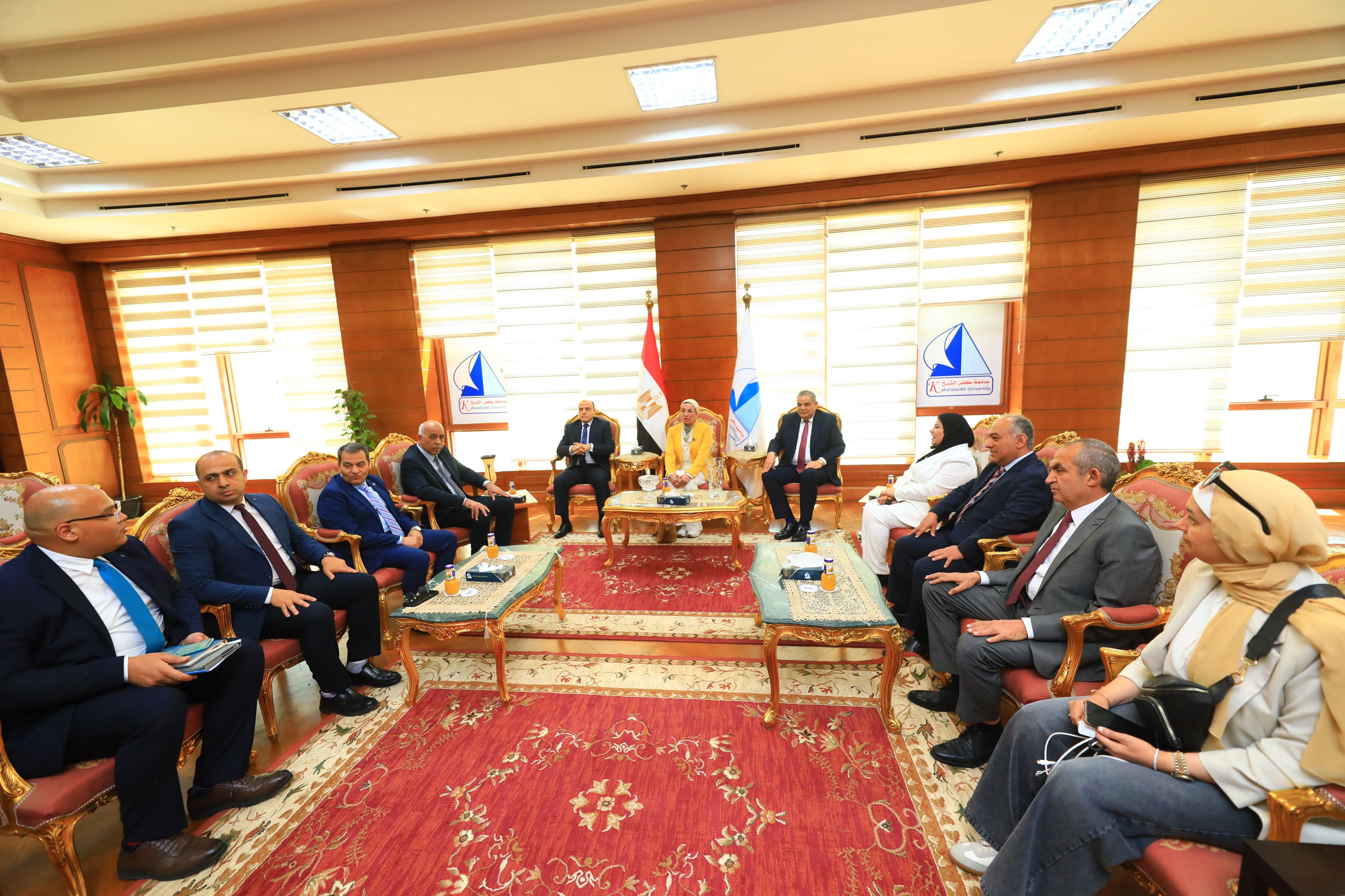 استقبل الدكتور عبد الرازق دسوقي رئيس الجامعة، اليوم الاثنين الموافق 12/5/2025، الدكتور ياسمين فؤاد وزيرة البيئة، واللواء دكتور علاء عبد المعطي محافظ كفر الشيخ، وذلك قبيل انعقاد مؤتمر "الابتكار من أجل مستقبل أخضر" والذي تنظمه وزارة البيئة من خلال البرنامج الوطني لإدارة المخلفات الصلبة بالتعاون مع الوكالة الالمانية للتعاون الدولي خلال الفترة من 12 – 14 مايو 2025، والذي سيتم عقده بقاعة المؤتمرات الكبرى.