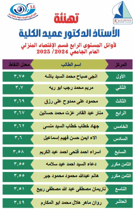 تهنئة الأستاذ الدكتور عميد الكلية لأوائل المستوى الرابع قسم الإقتصاد المنزلي العام الجامعي 2024 / 2025