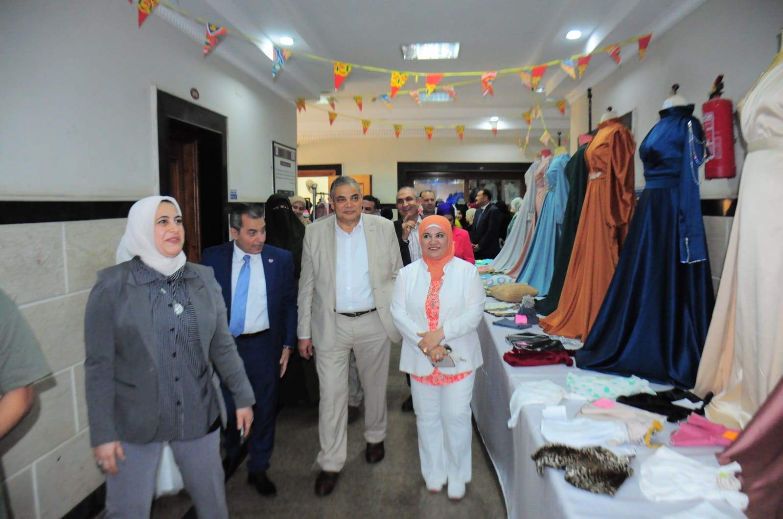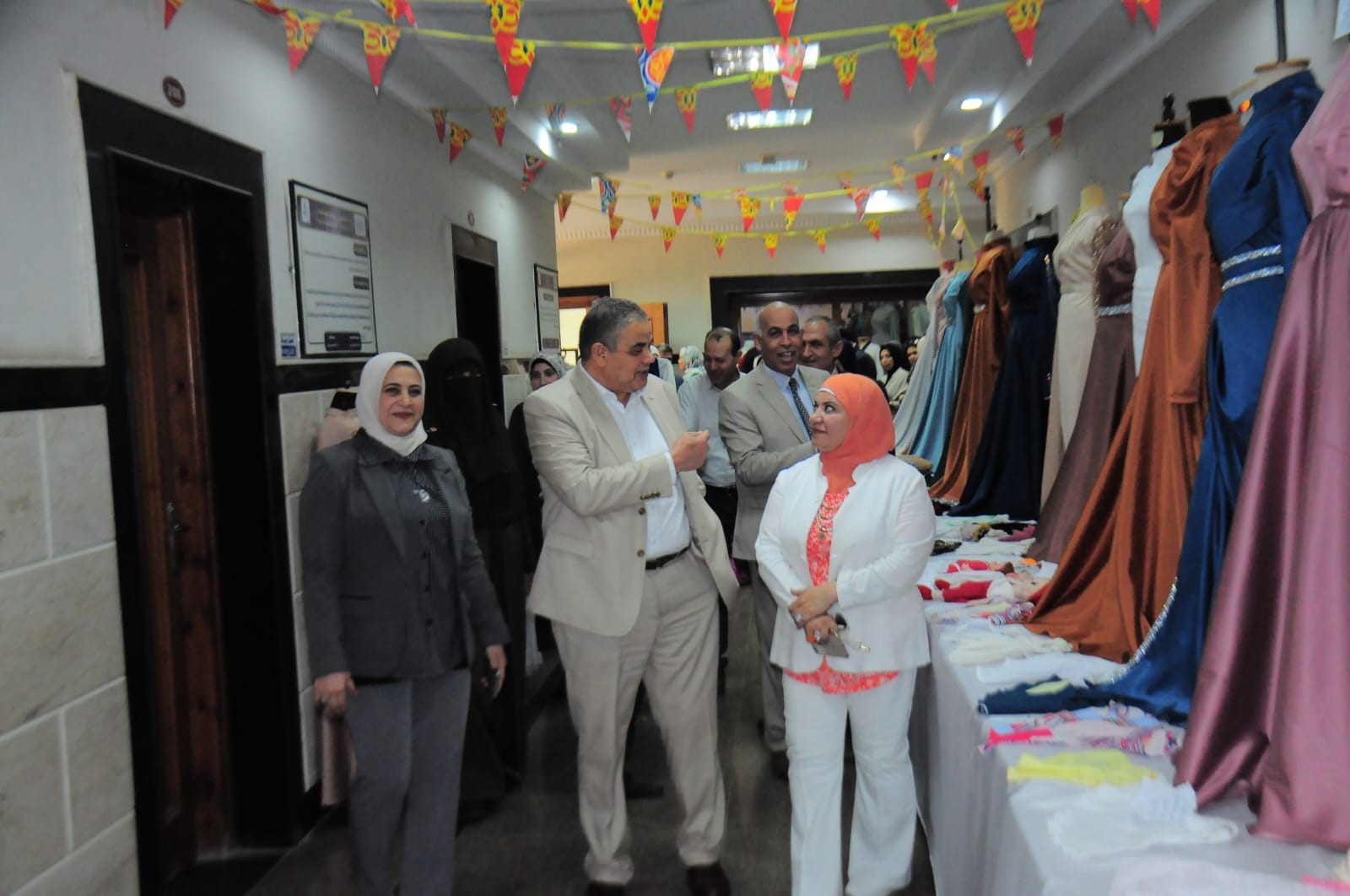 وجاء بالمعرض منتجات يدوية راقية بفن التريكو والكروشيه تحت إشراف ا.د/ إيناس الفواخري وتم عرض ملابس منزلية متنوعة مميزة تحت اشراف ا.د/ غادة عبد القادر حيث قدمت سيادتها ايضاً مطبوعات نسجية ذات طراز راقي لمقرر طباعة الملابس والمفروشات، وتم عرض فساتين سهرة ذات تصاميم راقية وجذابة لمقرر التشكيل على المانيكان تحت إشراف ا.د/ إيناس الفواخري ود. مروة عوض، كما عرضت ايضاً منتجات ملبسية لمقرر التذوق الملبسي تحت إشراف د/ مروة عوض