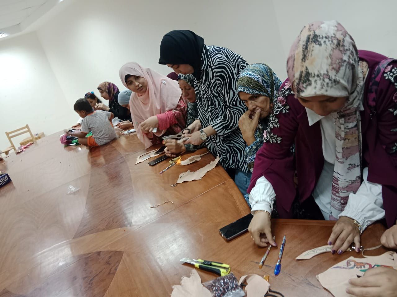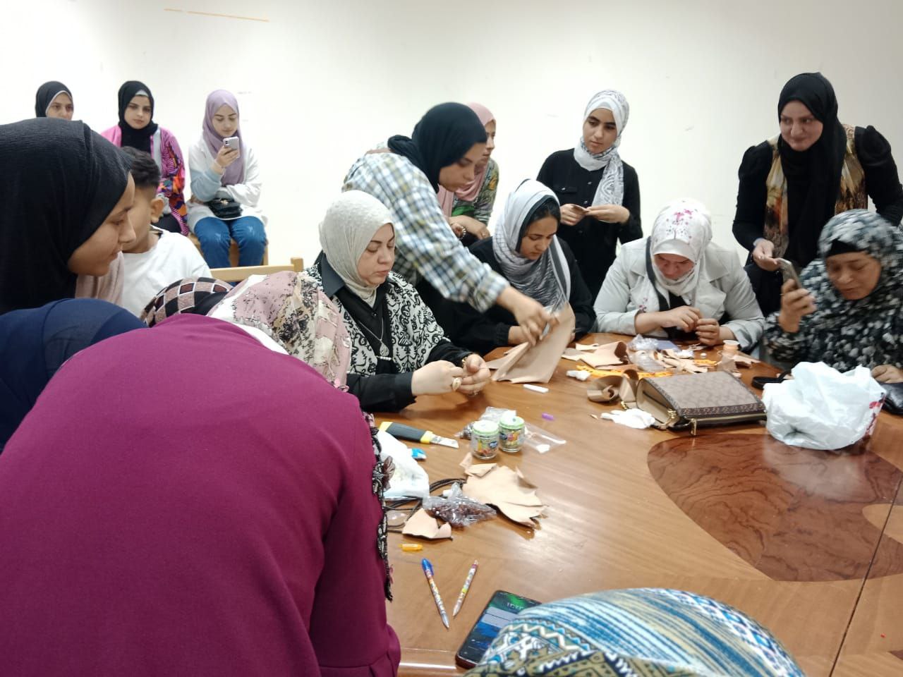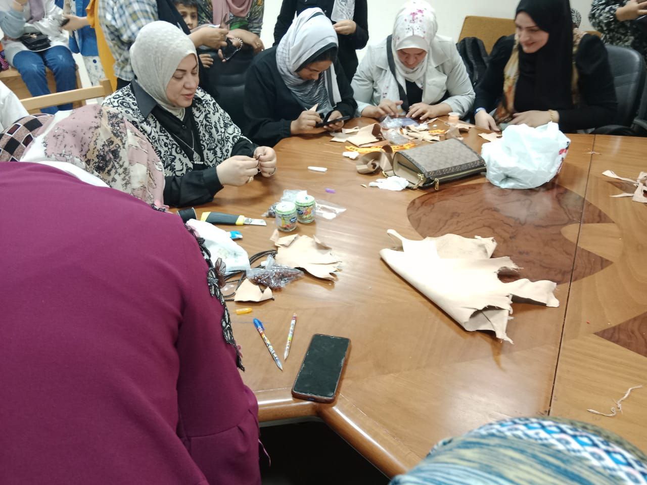وكانت الورشة الأولي من إعداد وتنفيذ الأستاذ الدكتور لمياء كرم صافى الأستاذ بقسم التربية الفنية والاستاذ الدكتور سماح الرفاعي الأستاذ المساعد بقسم التربيه الفنيه وبمعاونه المعيدة إكرام دياب المعيد بقسم التربيه الفنيه وطالبات الدراسات العليا ، واشتملت ورشه العمل عن أشغال الجلود الطبيعية واستخدام الجلد الطبيعي مع الخرز والخيوط والنحاس ودلايات فضيه لعمل الميداليات تحمل شعار( فلسطين) ،وتم تدريب 16 متدربه.