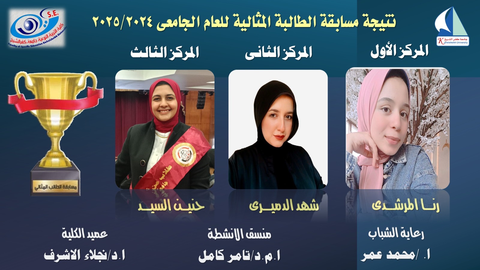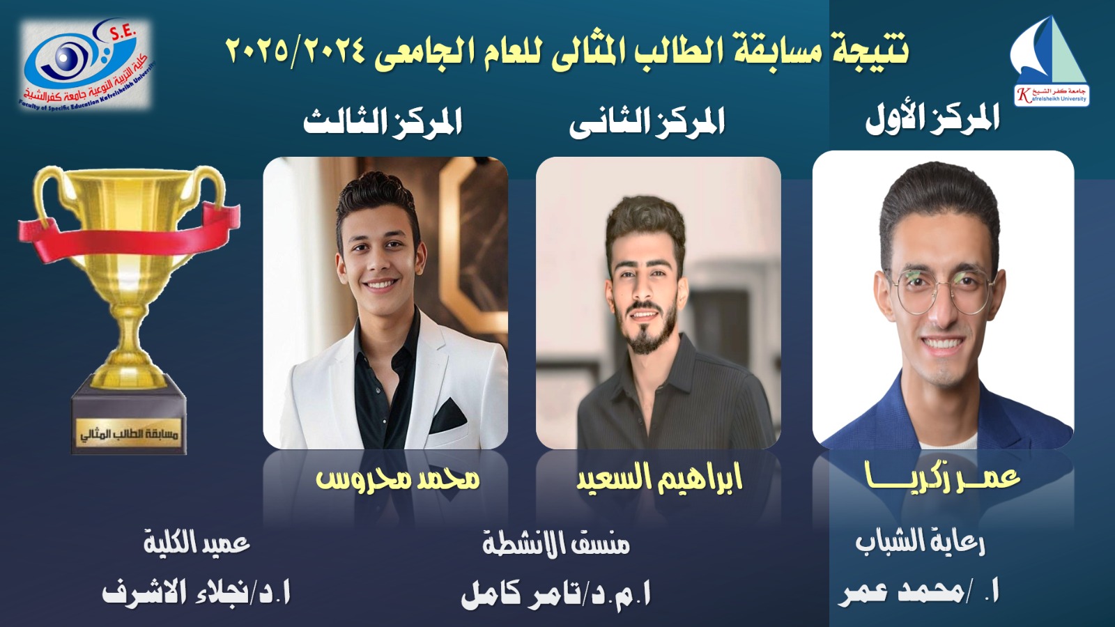 تحت رعاية الأستاذ الدكتور عبد الرازق دسوقى رئيس الجامعة والأستاذ الدكتور محمد عبدالعال نائب رئيس الجامعة لشئون التعليم والطلاب وإشراف الأستاذ الدكتور نجلاء الاشرف عميد الكلية الأستاذ الدكتور تامر كامل منسق الأنشطة الطلابية بالكلية وتنظيم رعاية الشباب أعلنت كلية التربية النوعية نتائج مسابقة الطالب المثالى والطالبة المثالية التي أقيمت الأربعاء الموافق 19 / 11 / 2024 إجراء على مستوى كلية التربية النوعية جامعة كفر الشيخ في جو عالى من التنافس نظراً لعلو وتقارب مستويات الطلاب المقدمين وكانت النتائج كالاتي