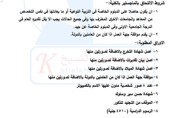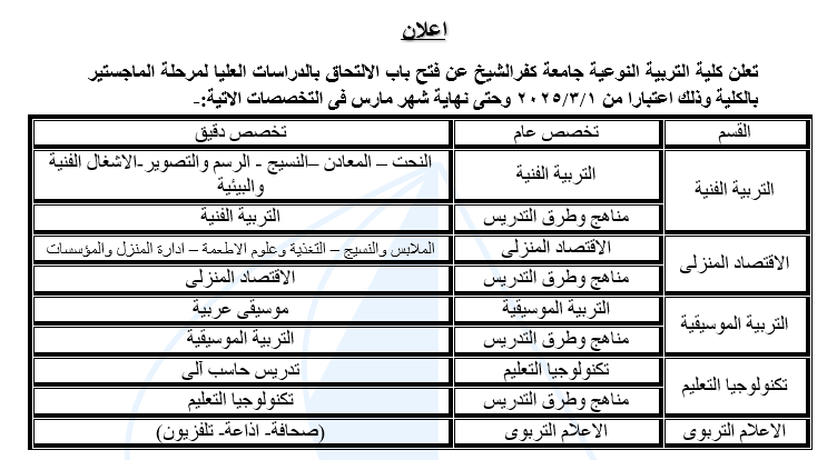 فتح باب الالتحاق بالدراسات العليا لمرحلة الماجستير بالكلية وذلك اعتبارا من 1/3/2025 وحتى نهاية شهر مارس
