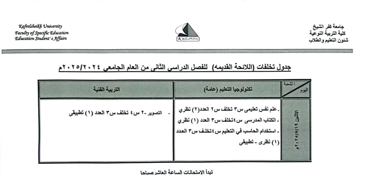 جدول الإمتحانات النظرية الفصل الدراسي الثاني(لائحة قديمة) + جدول التخلفات للعام الجامعي 2024/ 2025