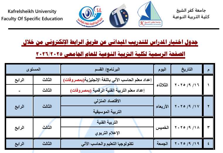 جدول اختيار المدراس للتدريب الميدانى عن طريق الرابط الإلكترونى من خلال الصفحة الرسمية لكلية التربية النوعية للعام الجامعي 2025/2026